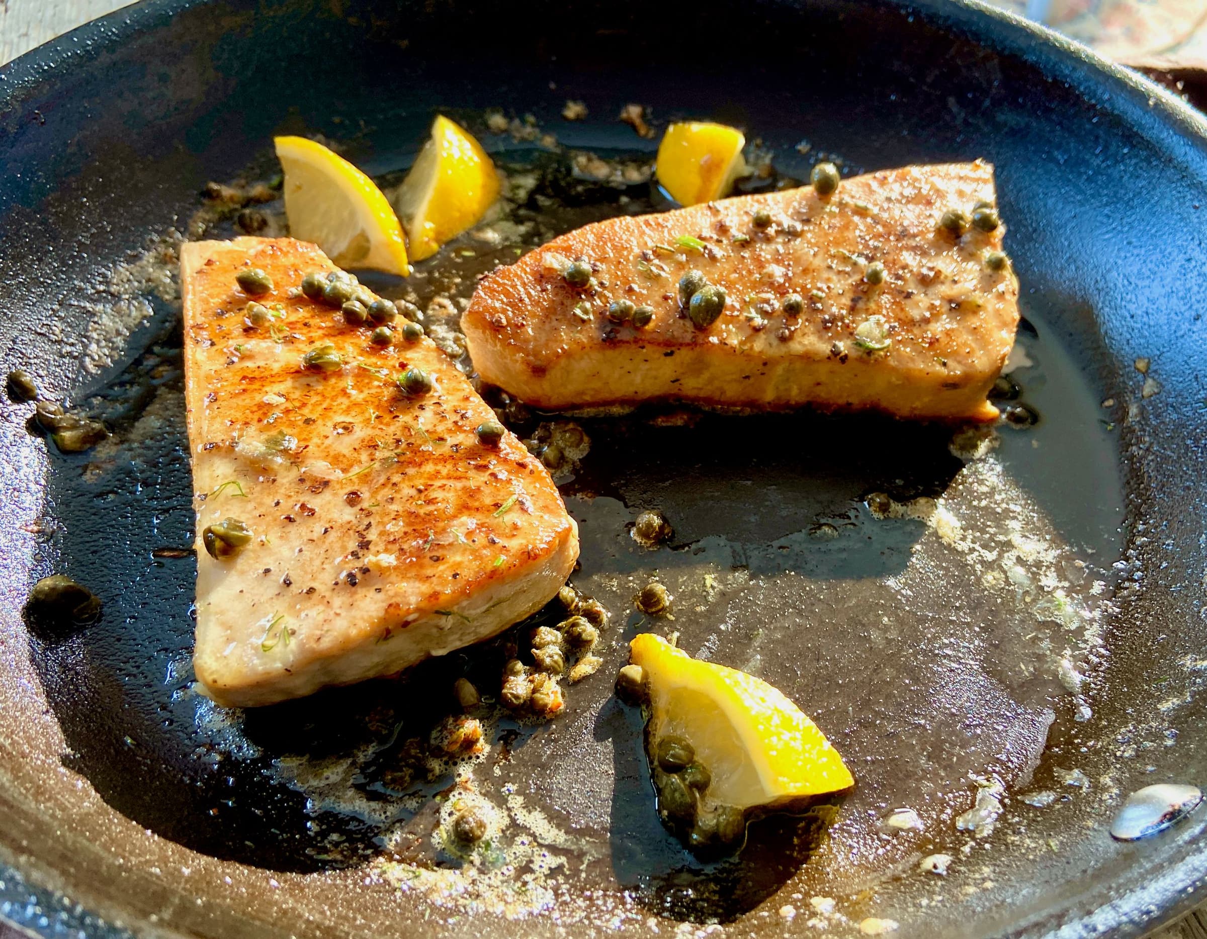 Tilt the skillet and spoon off any fat. Add the butter, capers, and lemon wedges and cook, spooning the melted butter over the fish until the underside is golden and an instant-read thermometer registers 120°F to 125°F in the center for medium-rare, 2 to 3 minutes depending on the thickness of the steaks. For more well-done swordfish, cook to 130°F for medium, 135°F for medium-well, and 145°F for well done fish.