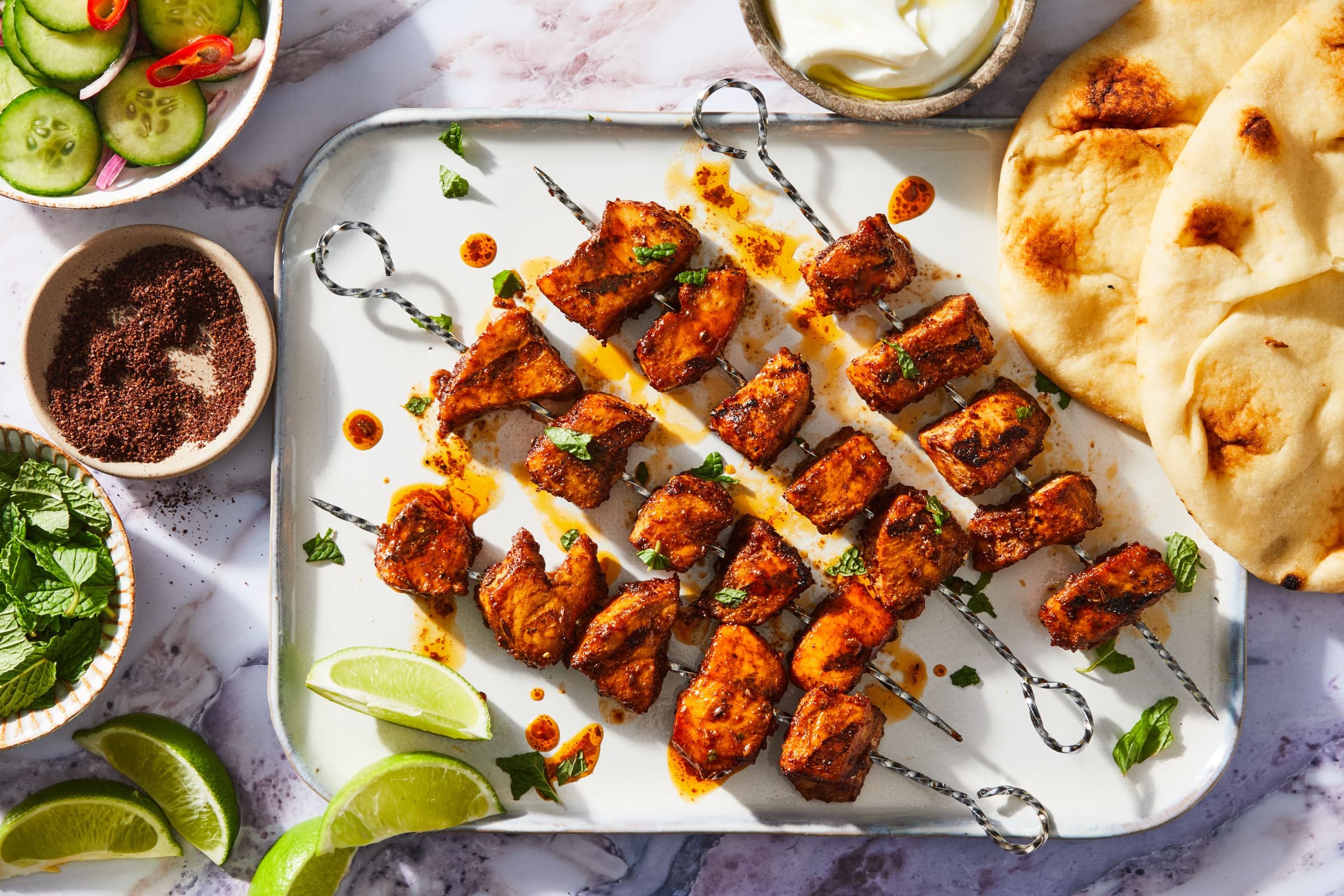 Meaty cubes of swordfish are coated with a fragrant Moroccan-inspired spice blend before being grilled to perfection. It’s served with a quick-pickled cucumber salad to balance the richness of the fish. If you have premade harissa spice blend in your pantry, use 1 tablespoon in place of the ancho, cumin, coriander, caraway, and cayenne.
