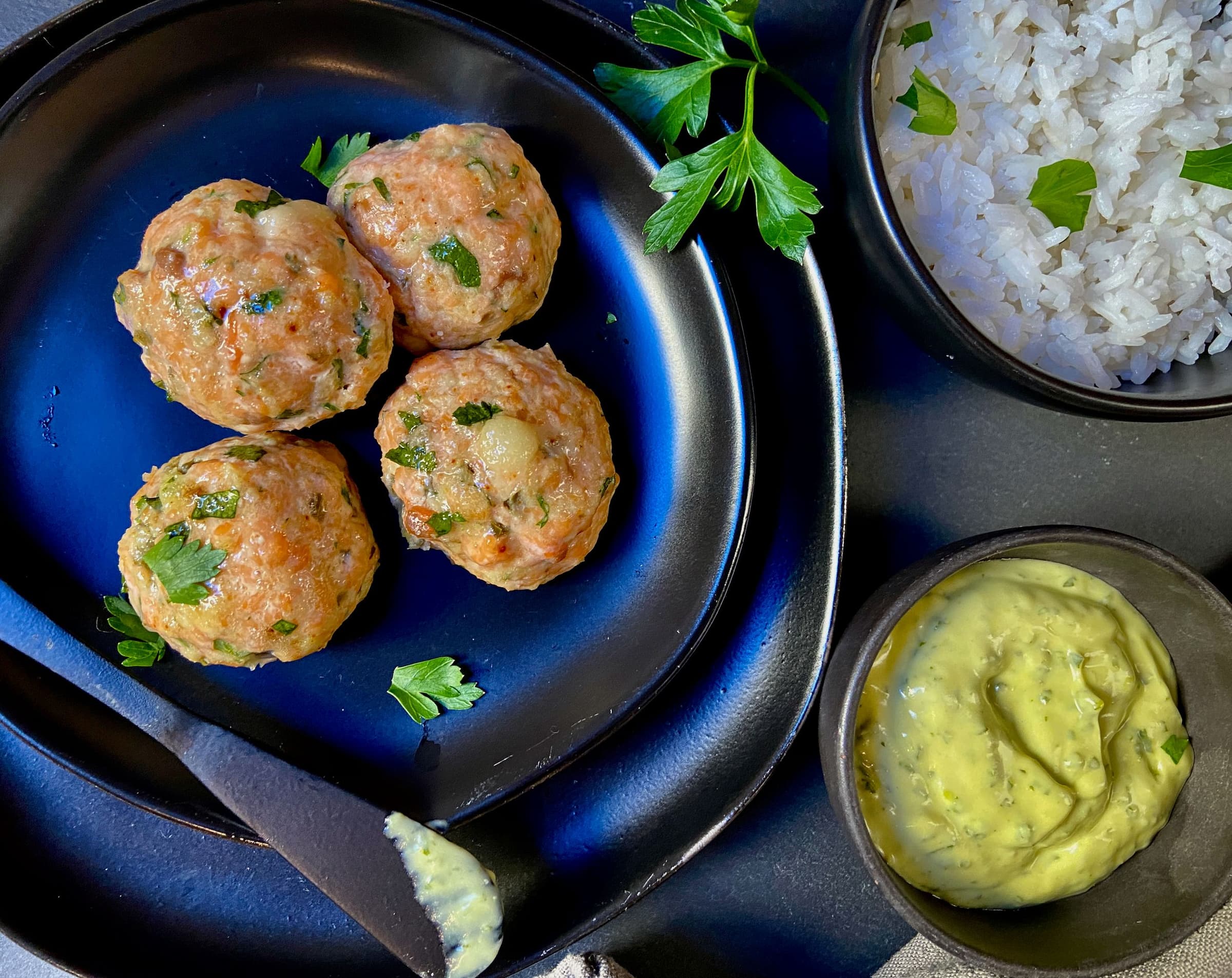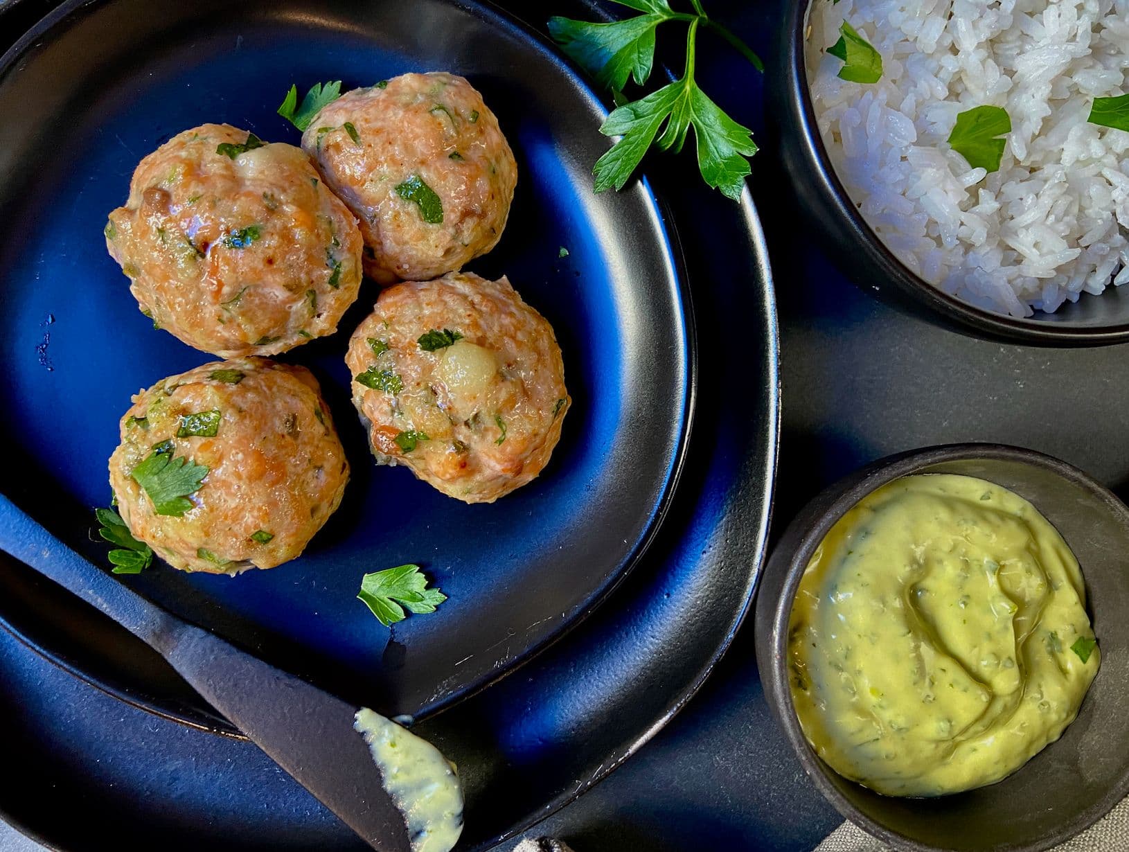 Transfer the meatballs to plates and drizzle with the avocado mixture. Serve with steamed rice.