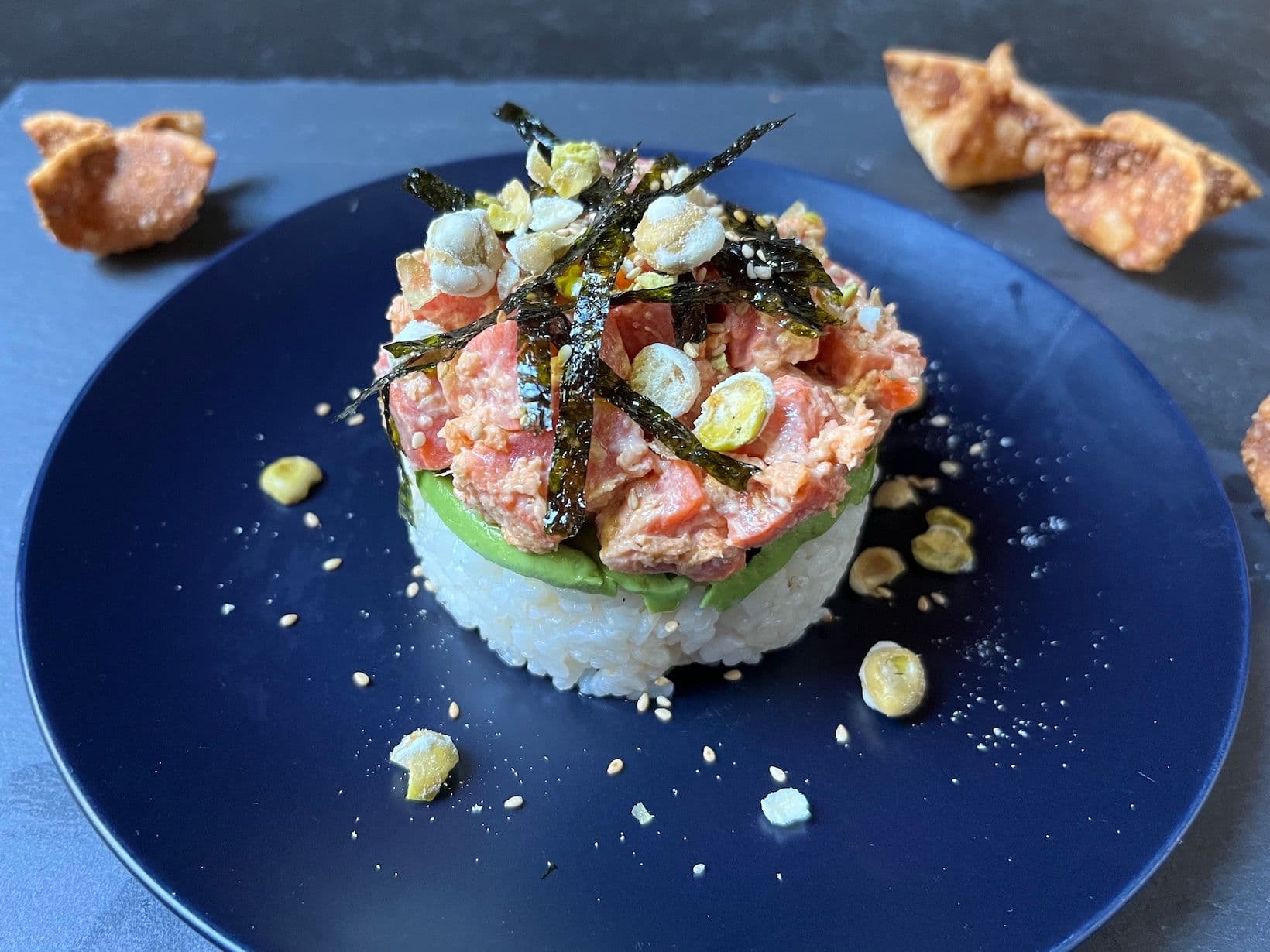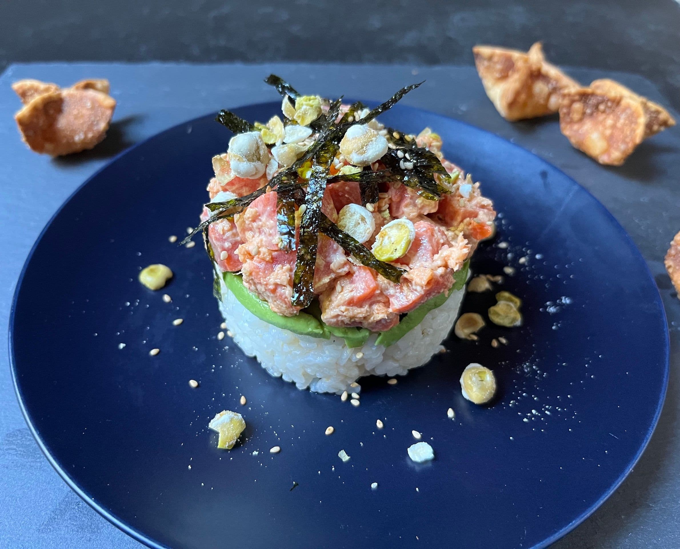 Set a 3-inch ring mold, biscuit cutter, mason jar lid, or bottom- and topless tuna fish can onto a plate. Add ¼ of the rice, pressing to an even layer. Add ¼ of the avocado, followed by ¼ of the salmon. Remove the mold and repeat with the remaining ingredients.