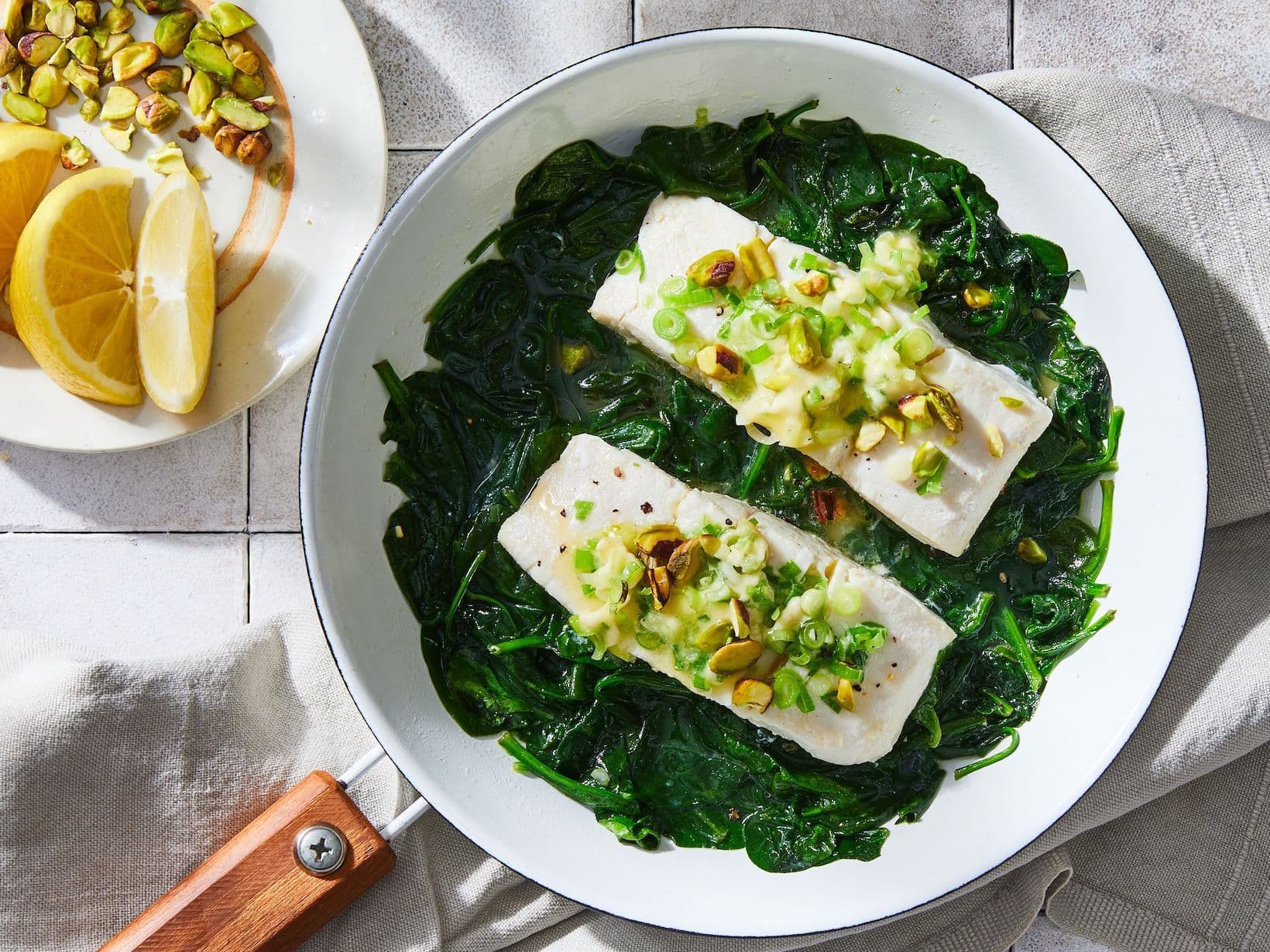 Use a spatula to transfer the fish and spinach to shallow bowls. Spoon the pan juices over the top, then garnish with the pistachios. Serve right away, with crusty bread and lemon wedges alongside.