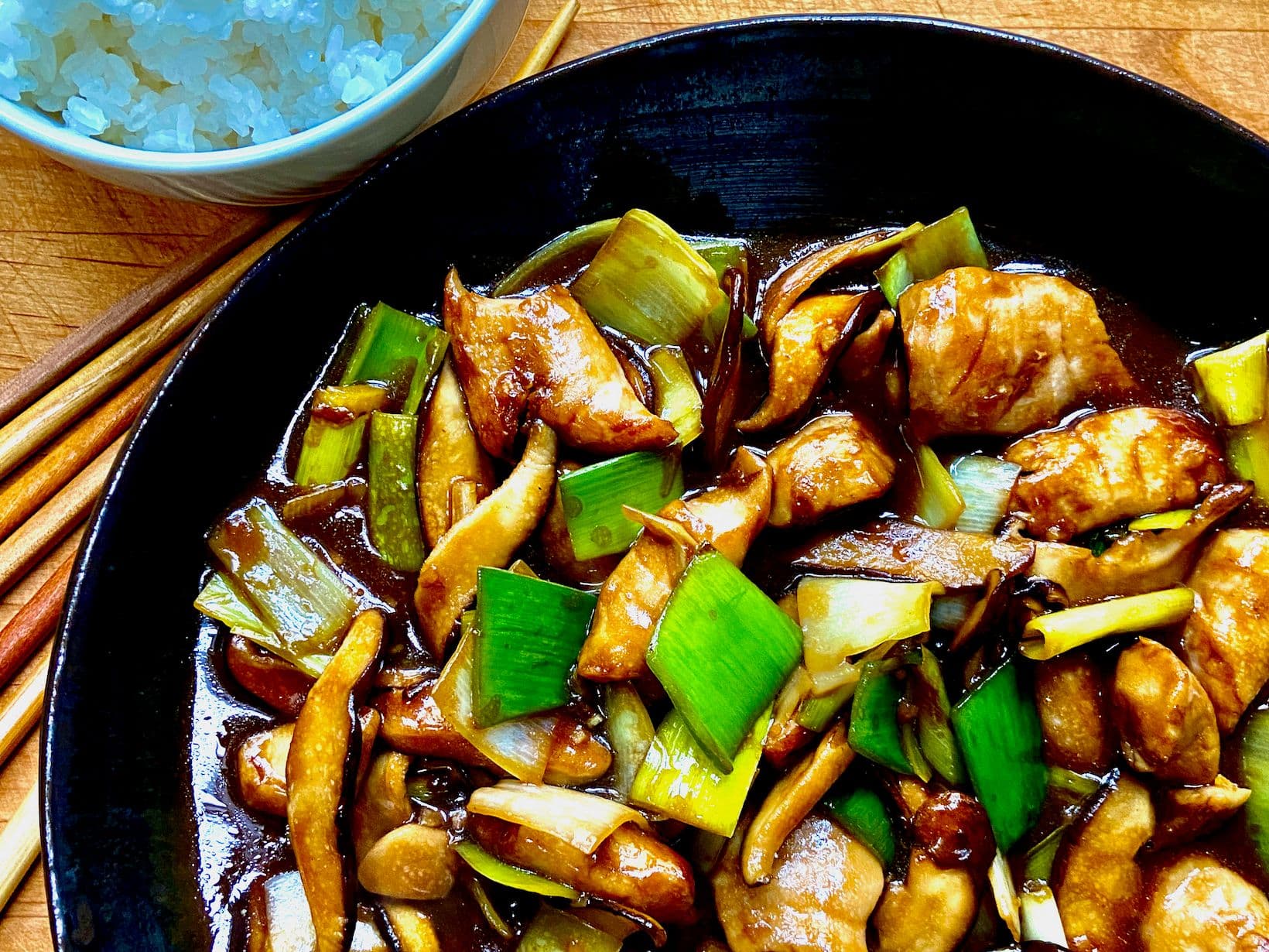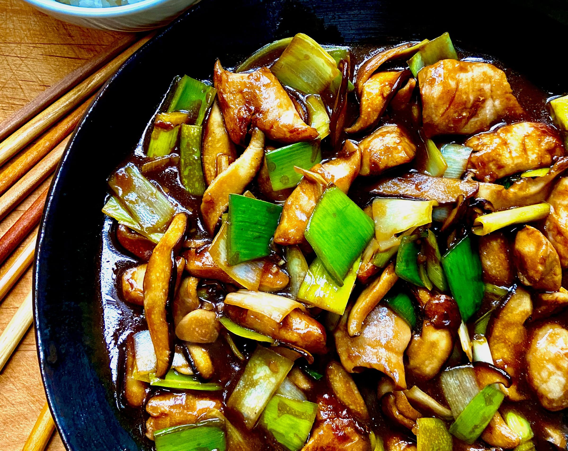 Add the ginger and cook until fragrant, about 30 seconds. Return the mushrooms and leeks to the skillet and stir-fry until combined. Whisk the cornstarch slurry into the reserved marinade, then add it to the skillet and bring to a boil. Cook, stirring occasionally, until the sauce is thickened and glossy, about 2 minutes.