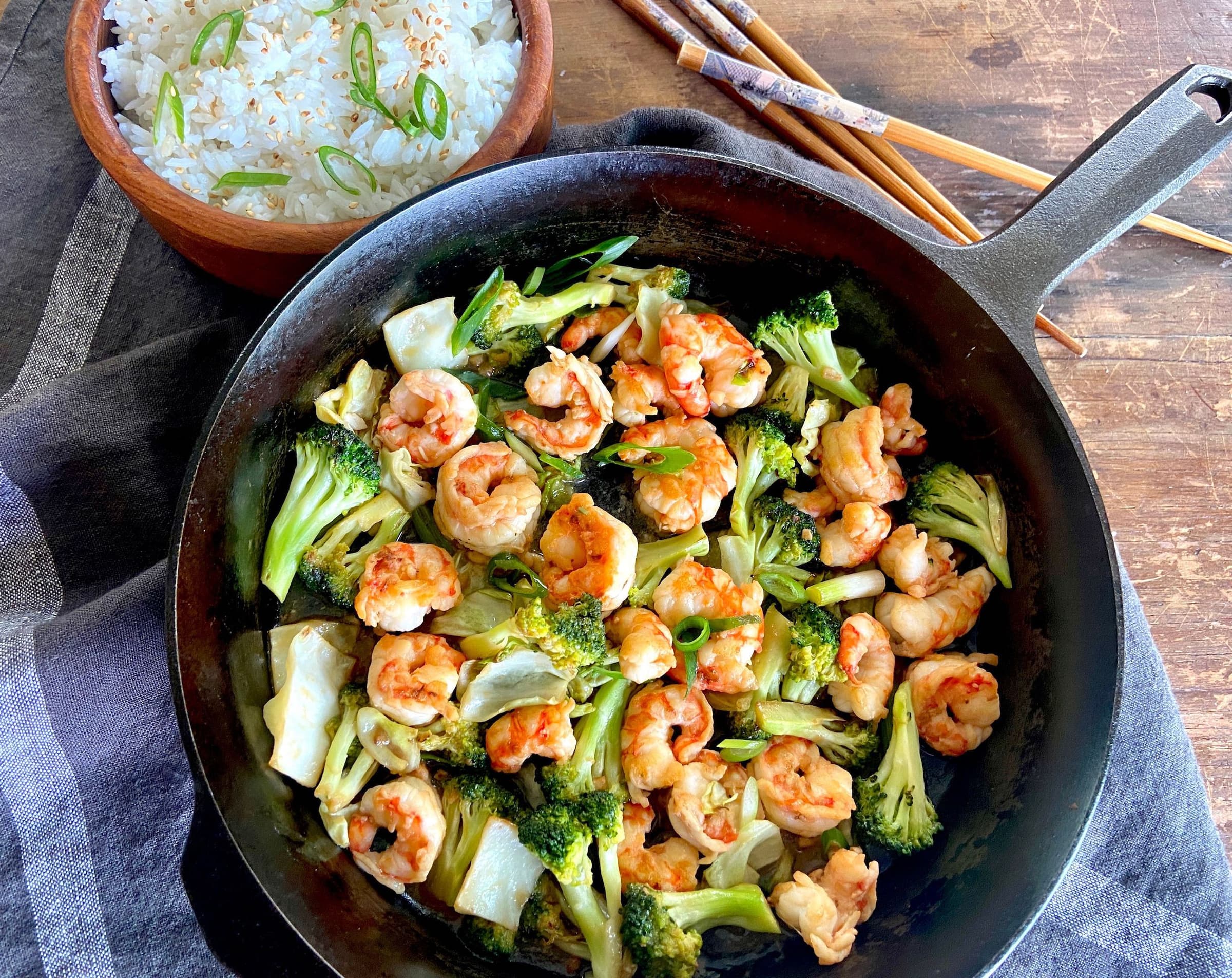 Stir the reserved sauce, then add it to the wok or skillet and bring to a boil. Cook, stirring occasionally, until the sauce is thickened and glossy and coats the shrimp and vegetables, about 2 minutes.