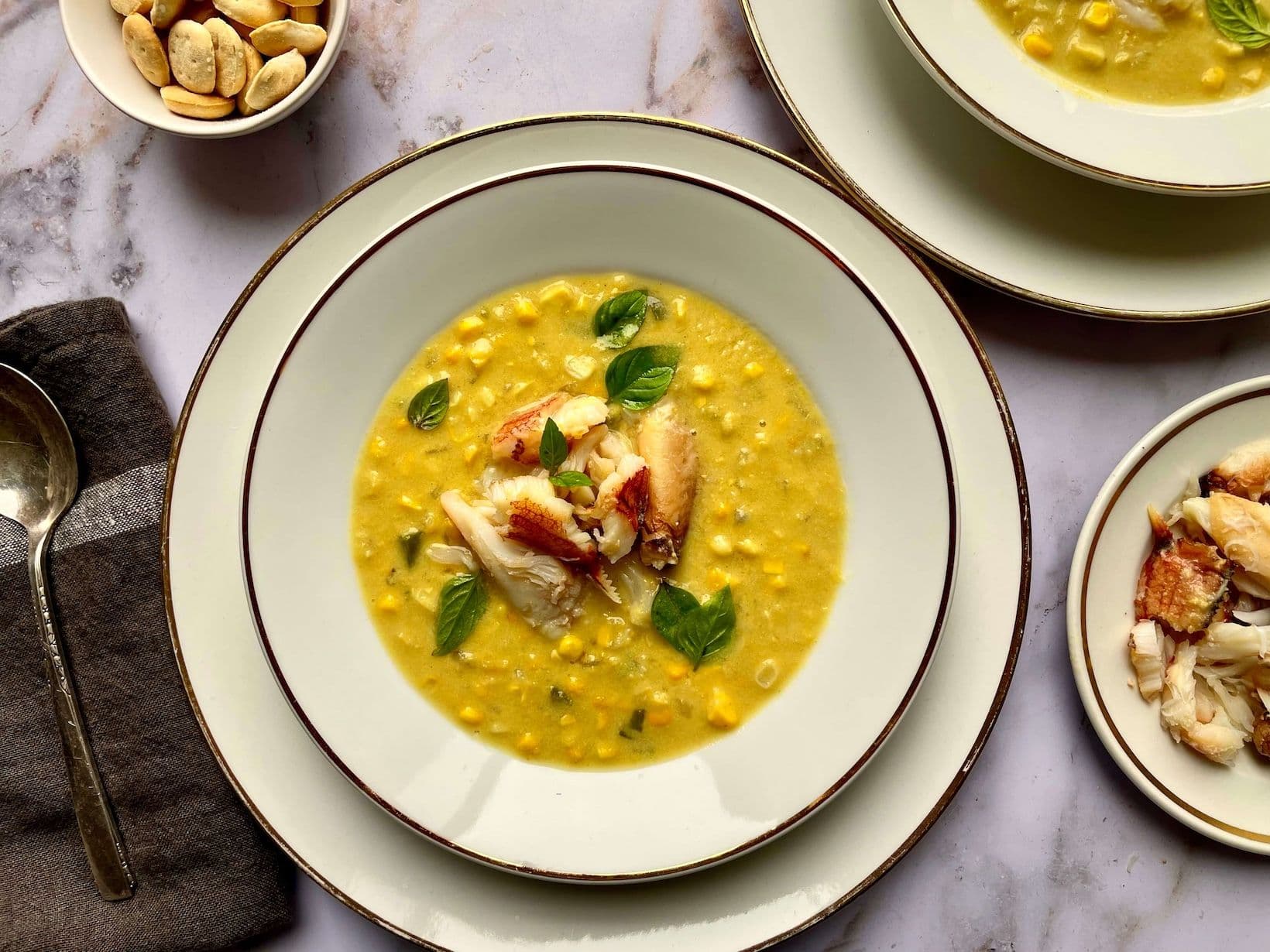 Ladle the chowder into bowls and top with the crabmeat and basil leaves. Serve with oyster crackers if desired.