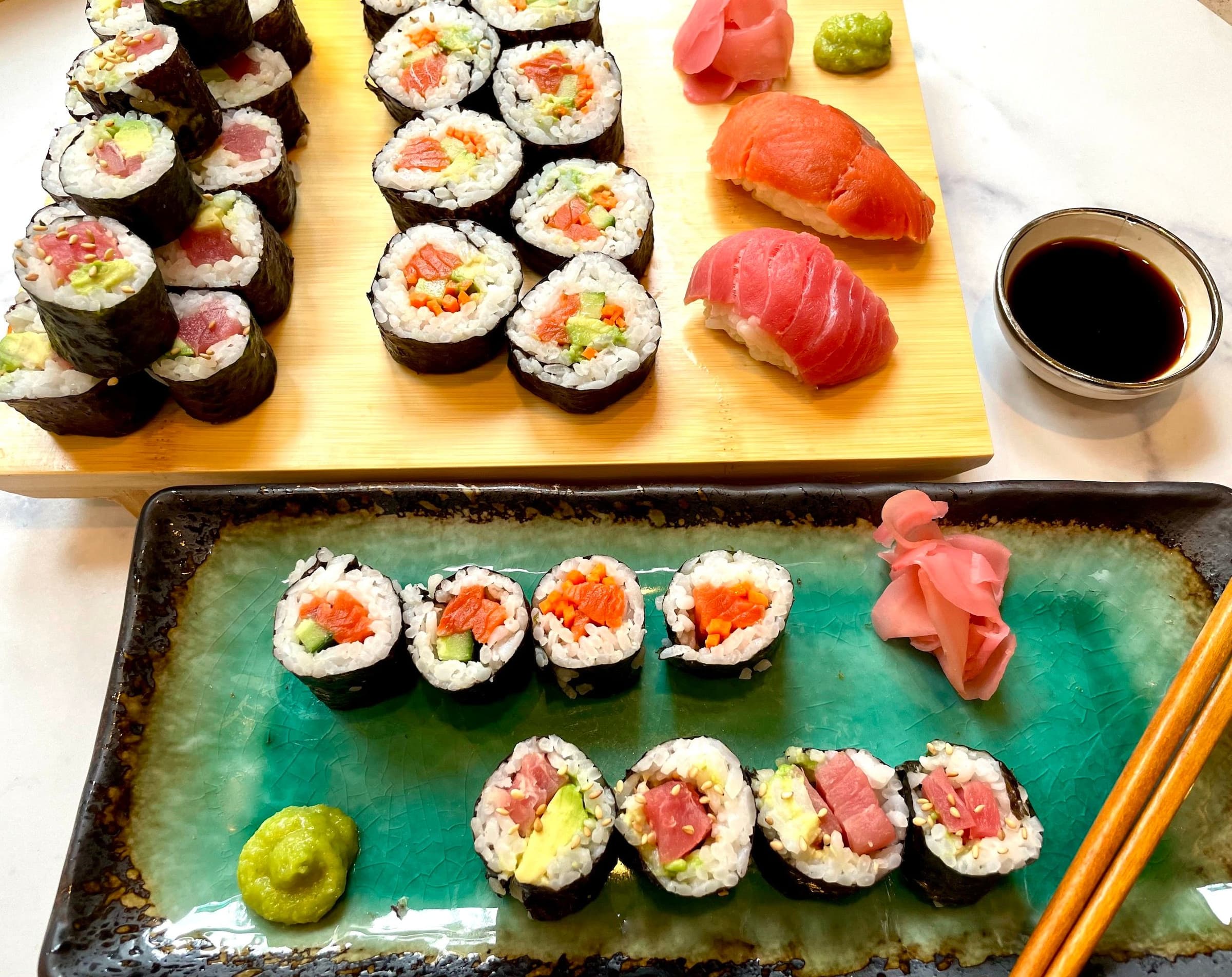 If making larger maki rolls (chumaki or futomaki), spread 1 scant cup of rice across the bottom three-quarters of a full sheet of nori. Add a strip of fish along with scallions, carrots, cucumbers, and avocado before rolling up