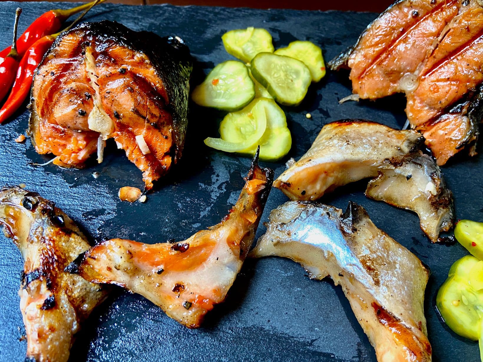 Salmon collars, at one time of little interest to American palates or culinary habits, have gained more and more popularity thanks to chefs who serve them at Japanese restaurants. Collars are cut just behind the gills and include the collarbone and fatty, rich belly meat. They make use of offcuts that would ordinarily be enjoyed by fishermen or used as bait. King salmon collars are much larger than other salmon collars and are especially rich and meaty. The collars are brined and then grilled—you can split them laterally for easier grilling—resulting in sweet, sticky morsels to be wrapped in crunchy lettuce leaves and served with tangy pickles. Salmon steaks or thick-cut salmon roasts make a great alternative.