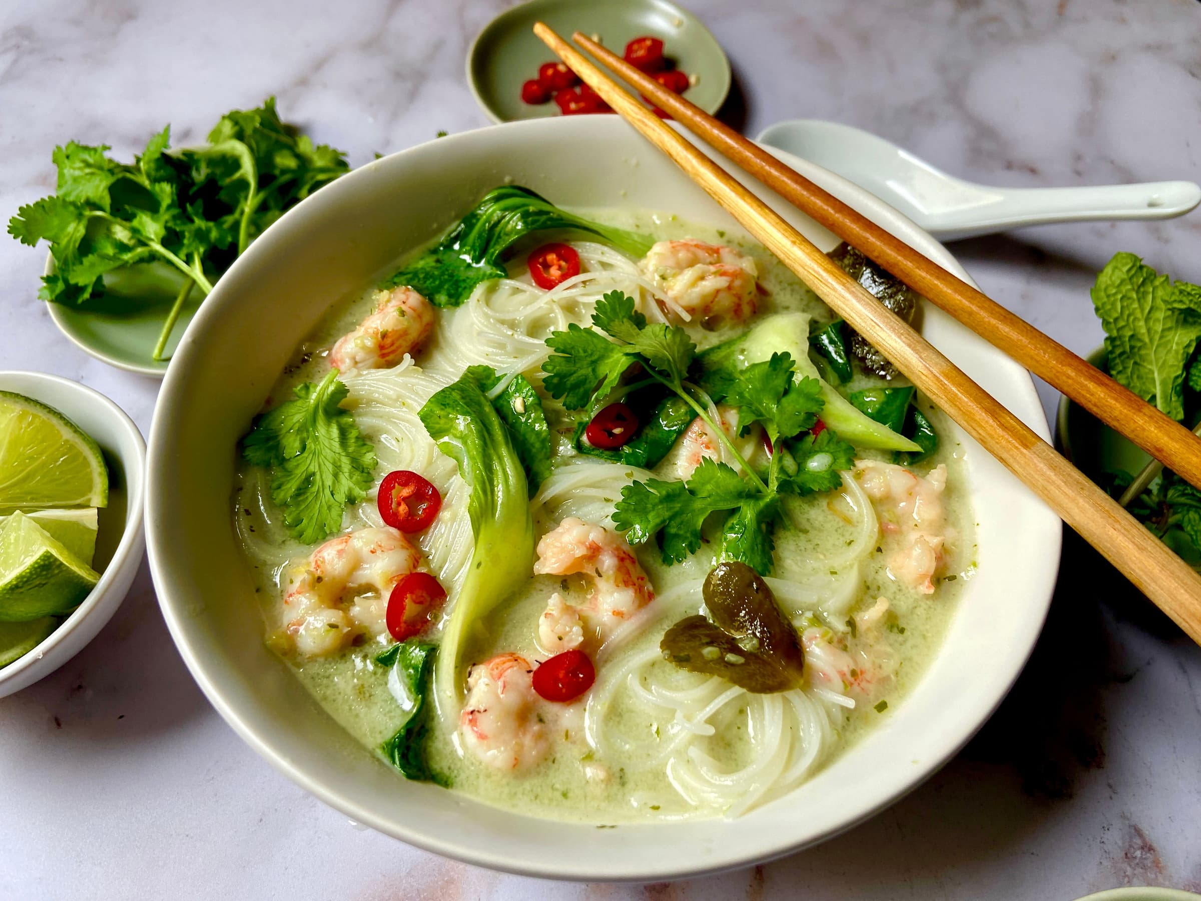 Divide the noodles between 4 bowls and ladle the seafood soup over top. Garnish with the herbs, chiles, and lime wedges. Enjoy!
