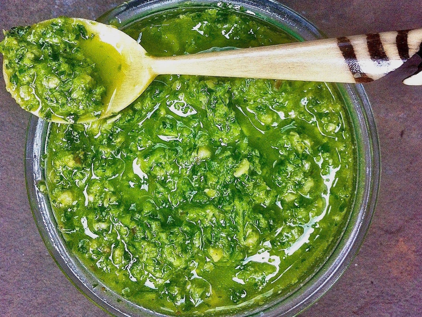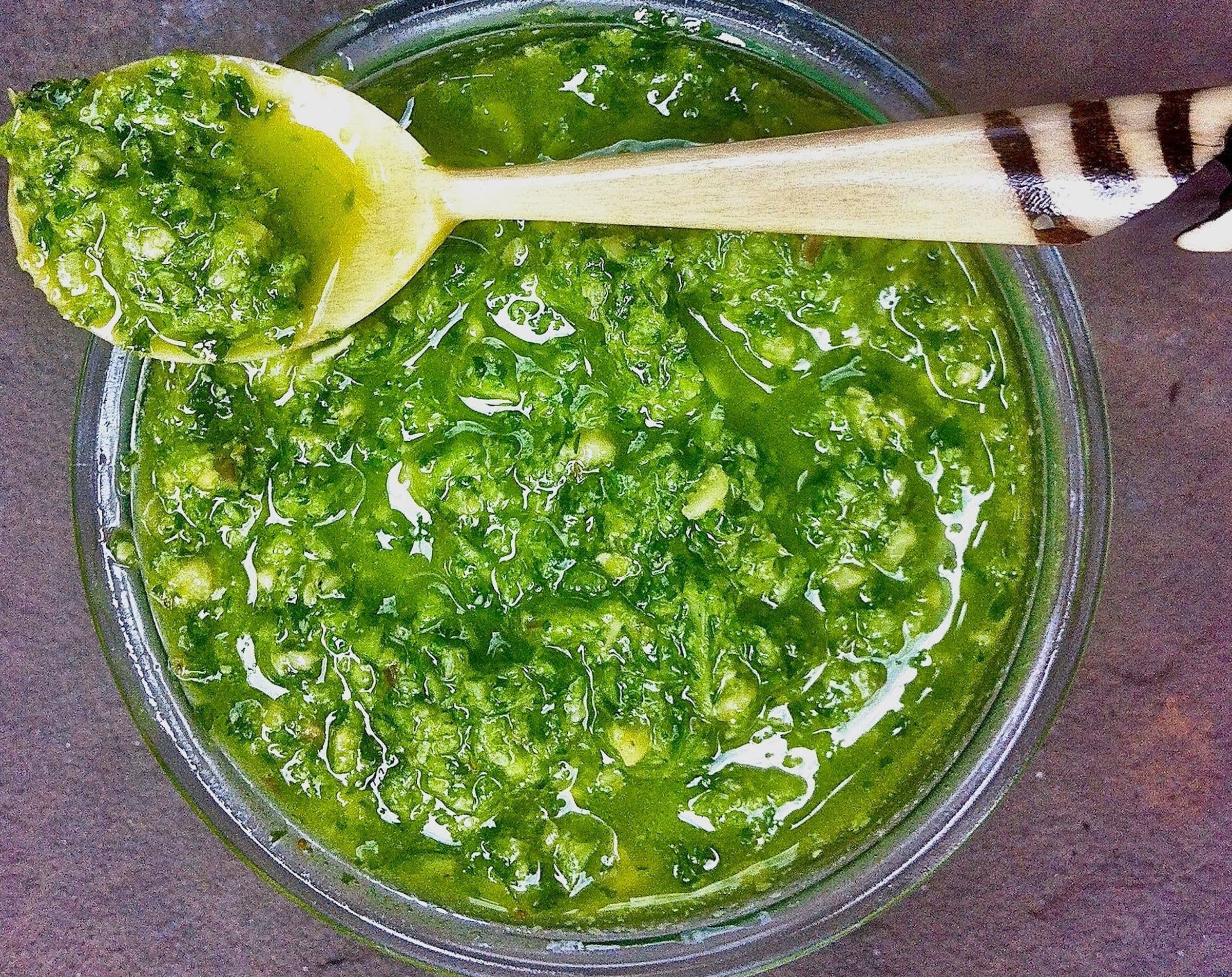 Using a large mortar and pestle or food processor, combine all of the ingredients except the oil and pound or process until coarsely puréed. Add the oil and pound or process until a fairly smooth paste forms. Use right away or freeze for up to 3 months.
