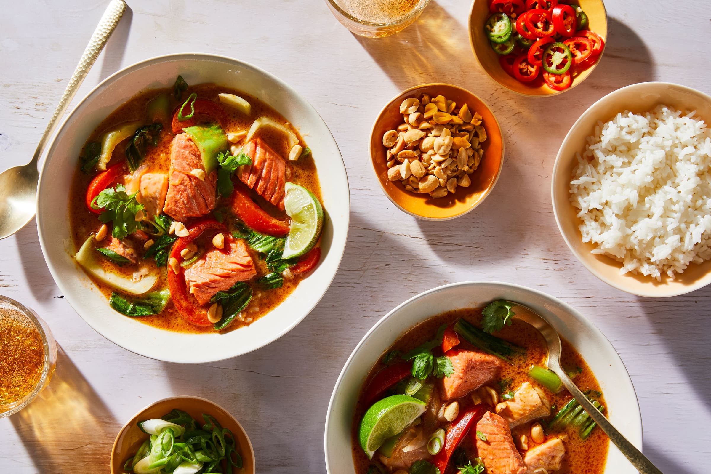 Steamed rice, fresh cilantro and Thai basil leaves, sliced scallions, chopped peanuts, sliced fresh chiles, and lime wedges for serving