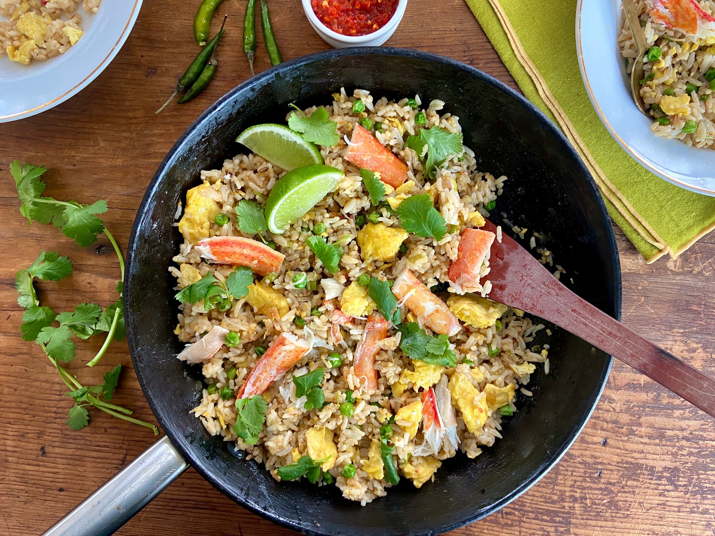 In this comforting dish, fragrant jasmine rice is stir-fried with lots of garlic, scallions, Thai chiles, and fish sauce. Quick-cooking scrambled eggs and picked crabmeat add protein and a hit of sweetness. You can use cooked chopped shrimp or diced lobster meat in place of the crab, or even leftover flaked fish from last night’s dinner.