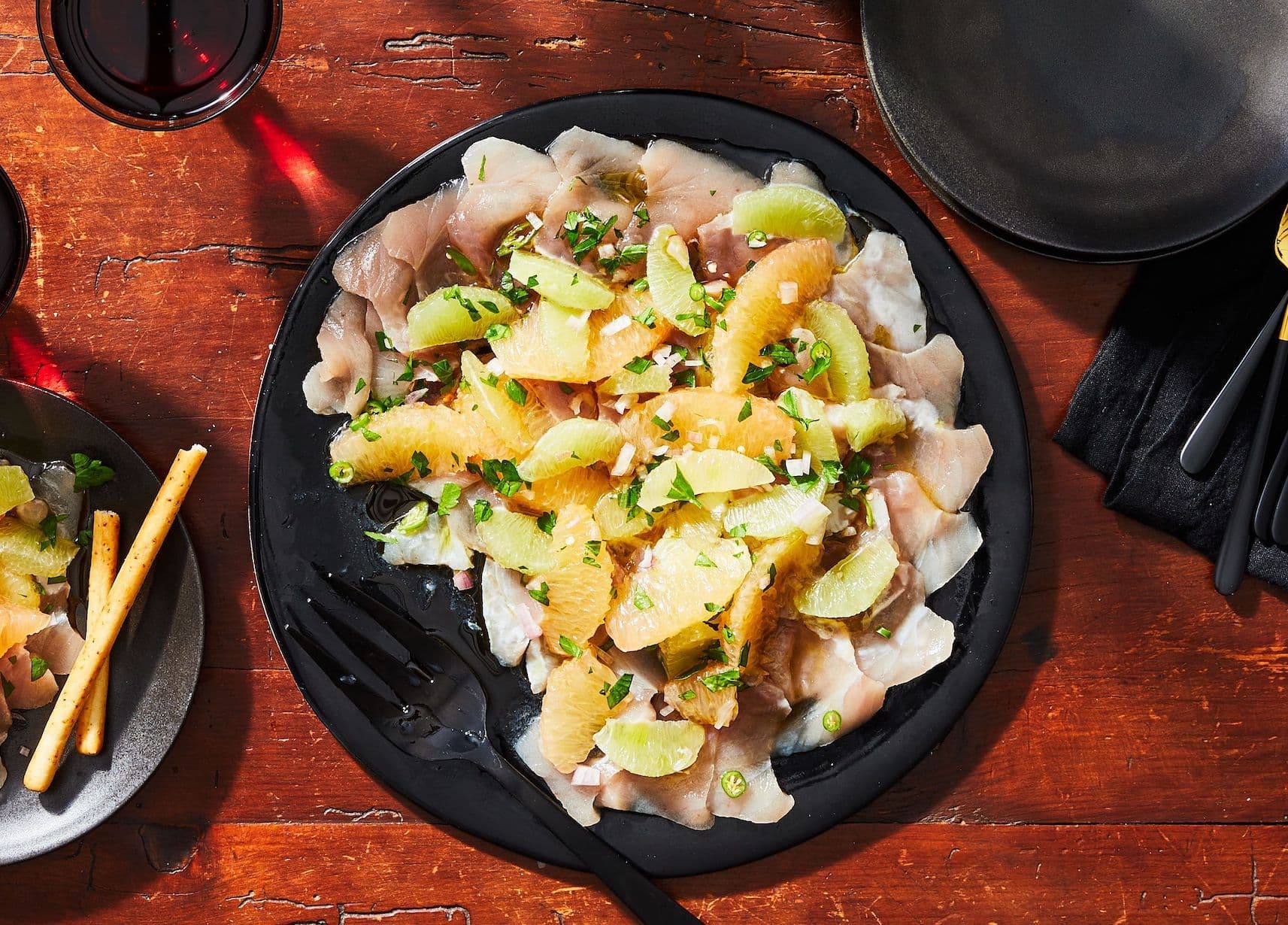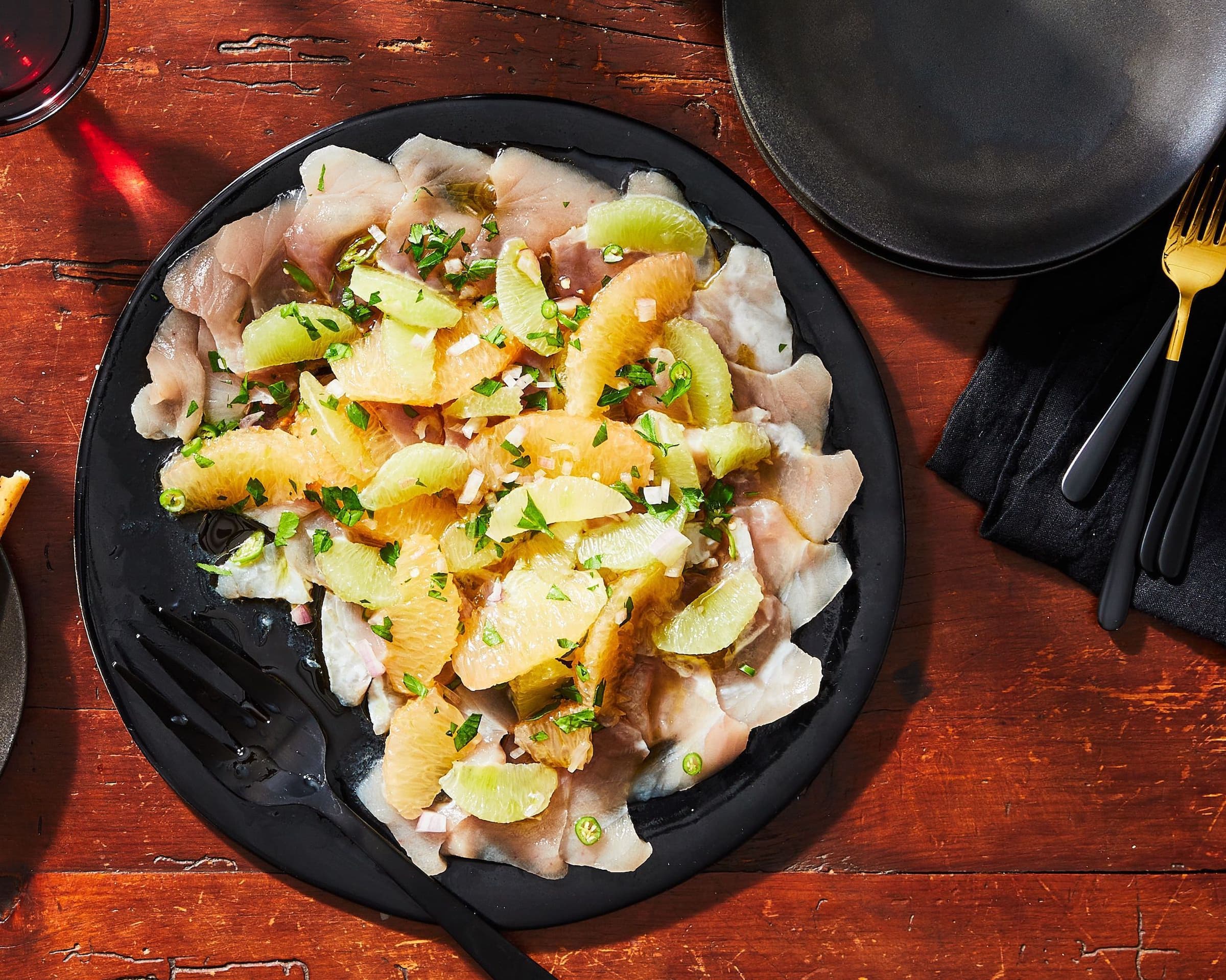 Carpaccio is very thinly sliced or pounded raw fish that is served chilled. It is a low-lift, elegant way to start a meal and one that can be done partly in advance. When ready to serve, dress it with a simple citrus dressing and aromatics and serve some grissini (thin breadsticks) alongside. Delicioso!