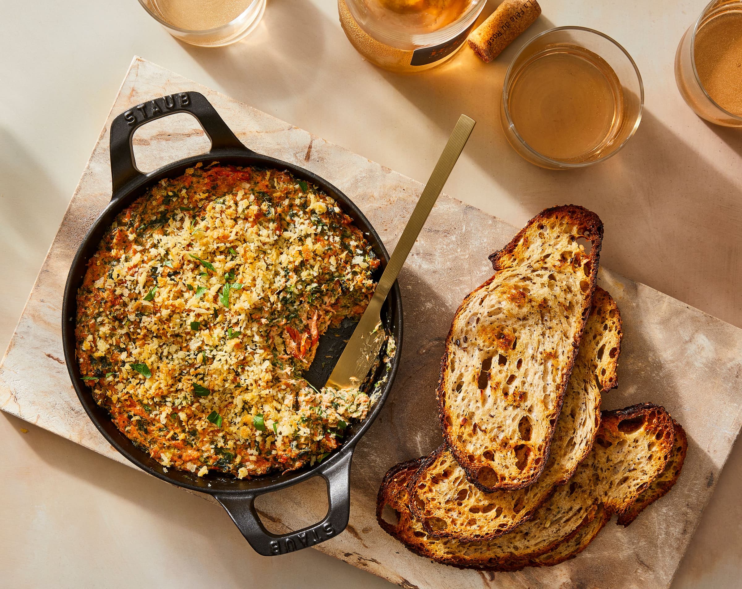 In a small bowl, combine the panko and butter and season lightly with salt. Sprinkle the panko evenly over the dip and bake until golden and heated through, 6 to 8 minutes. Serve warm with crackers or baguette slices for scooping.