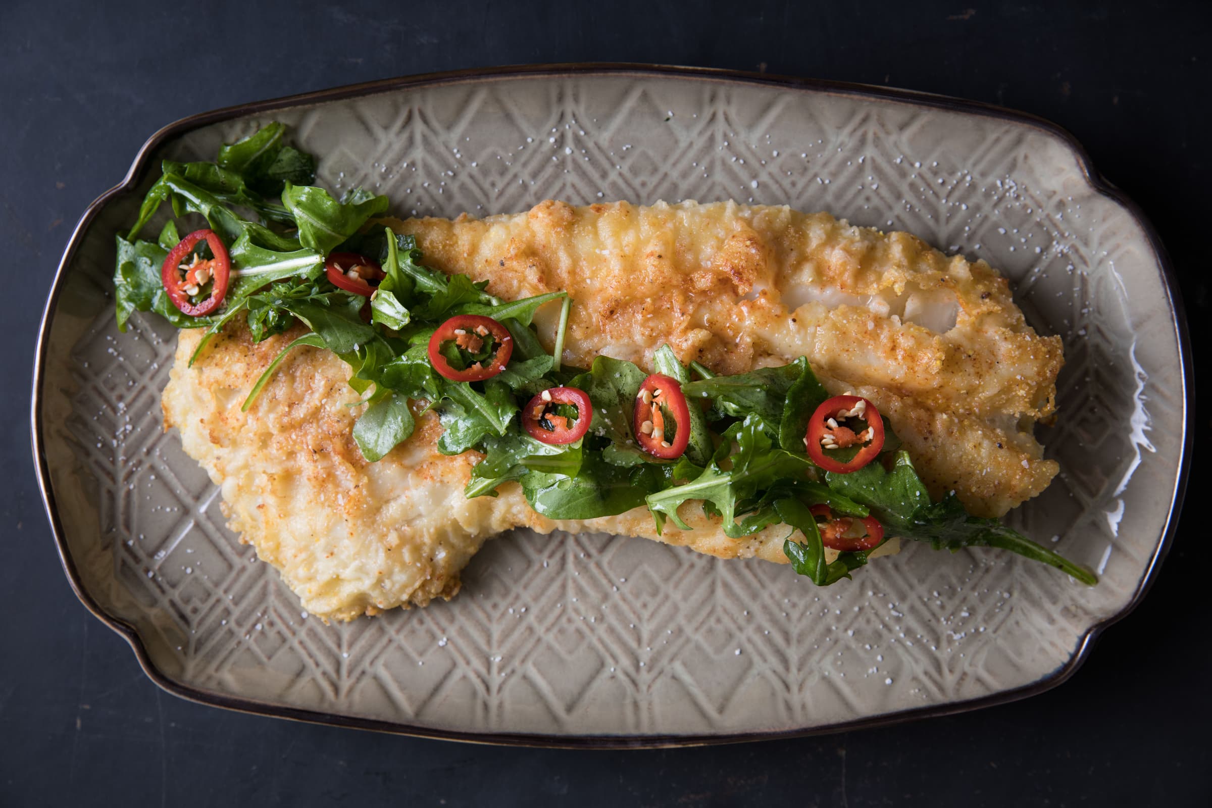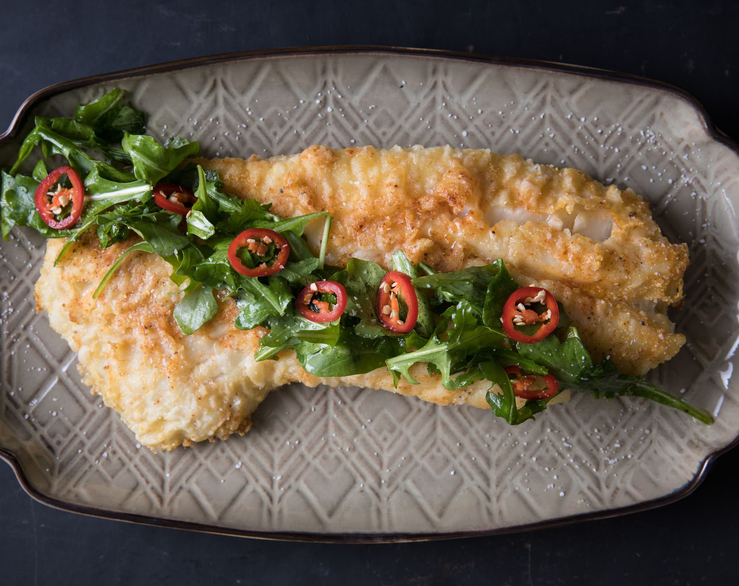 This play on the classic French technique of pairing a spicy salad with a quick-cooked and pounded fillet of pork or chicken works beautifully with fish fillets. In this recipe, the sweetness of the yelloweye contrasts perfectly with the peppery arugula, the acid of lemon, and spice of chilies.