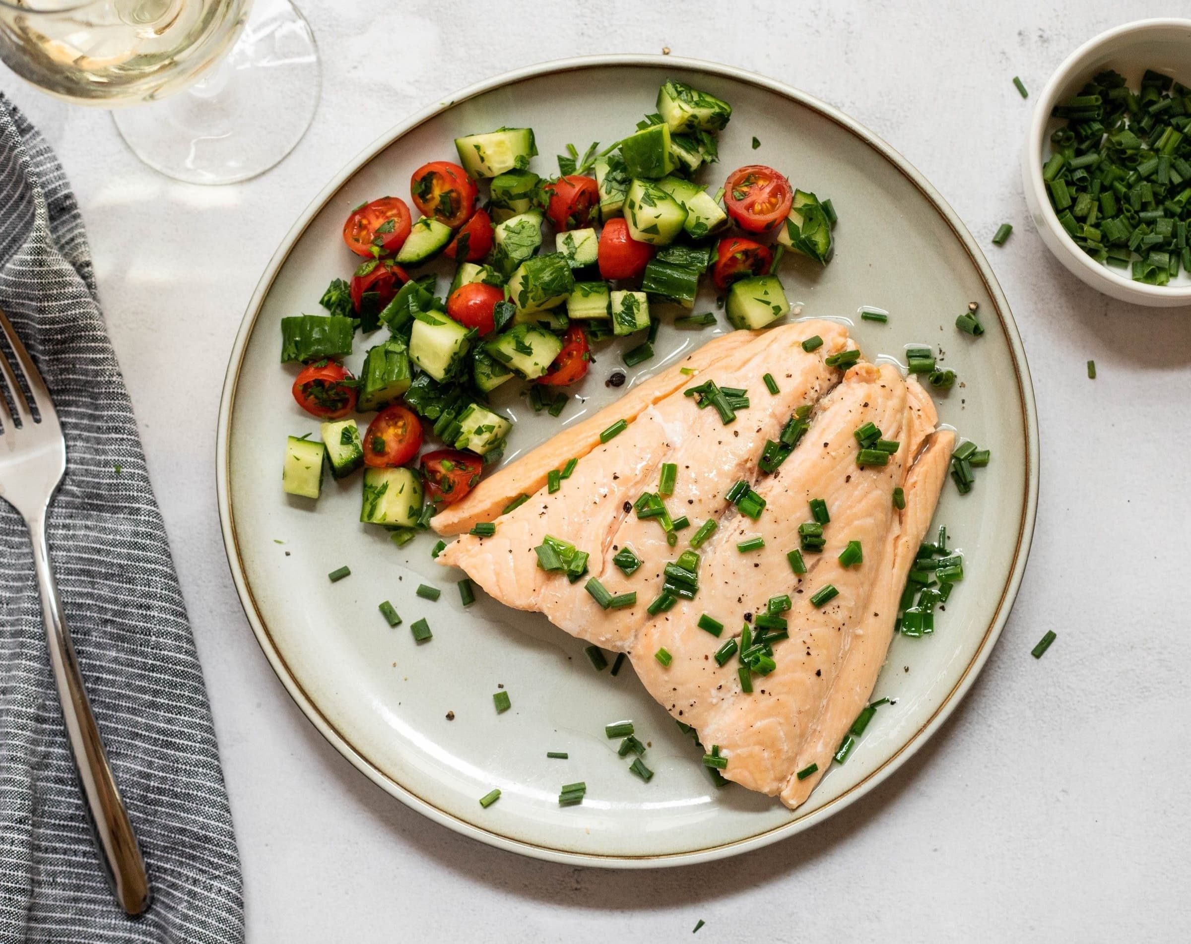 You can choose to leave skin on or remove it. If you do leave the skin on, make a few shallow scores with a sharp knife across the skin to prevent the fish from curling when it begins to heat in poaching liquid.