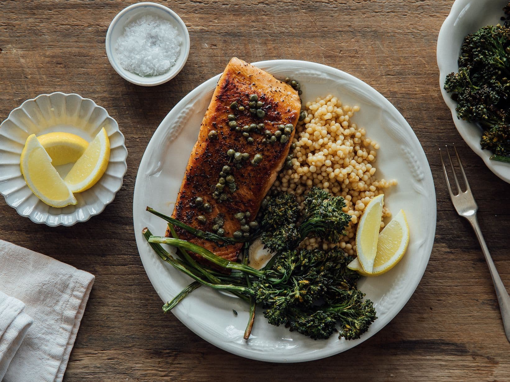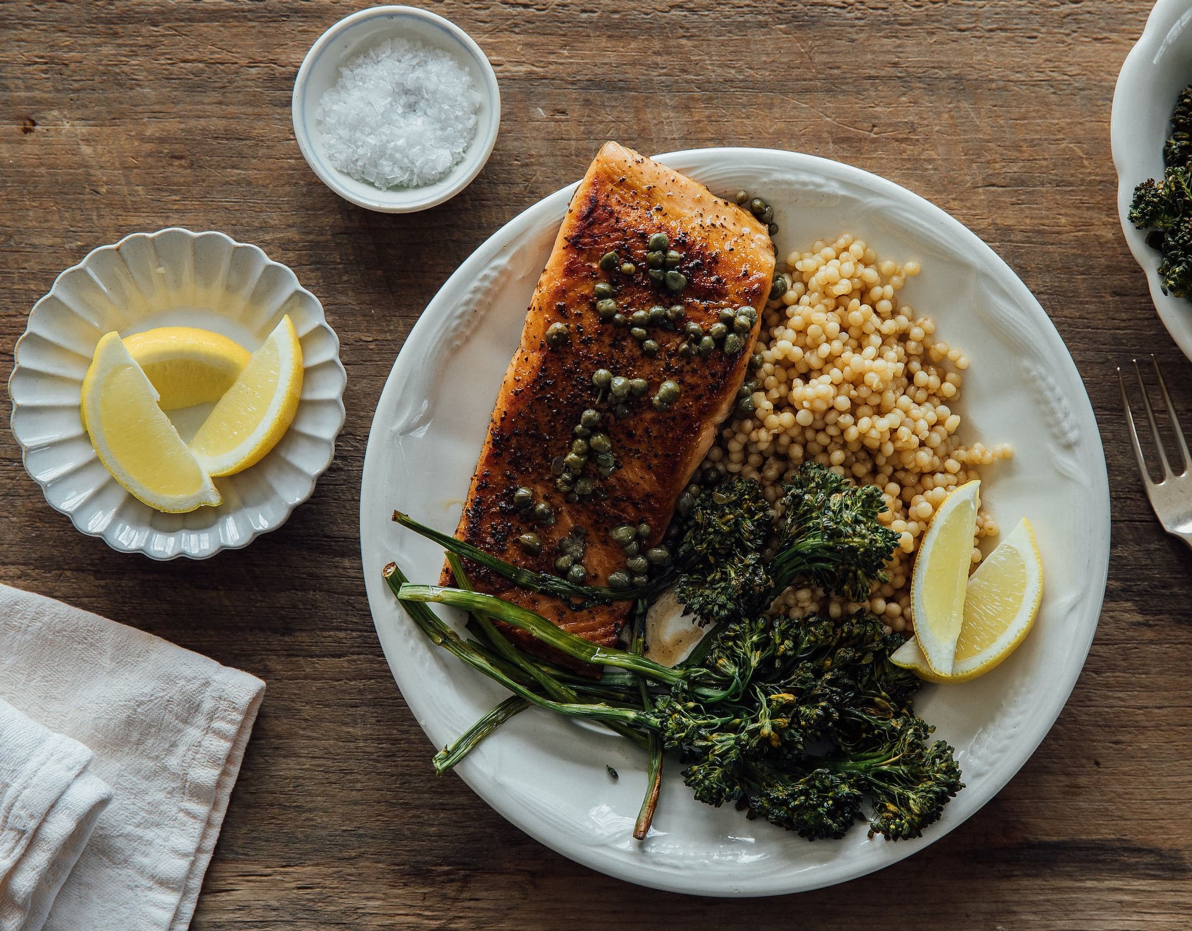 Pour the brown butter caper sauce over the salmon and serve the couscous and broccolini alongside.