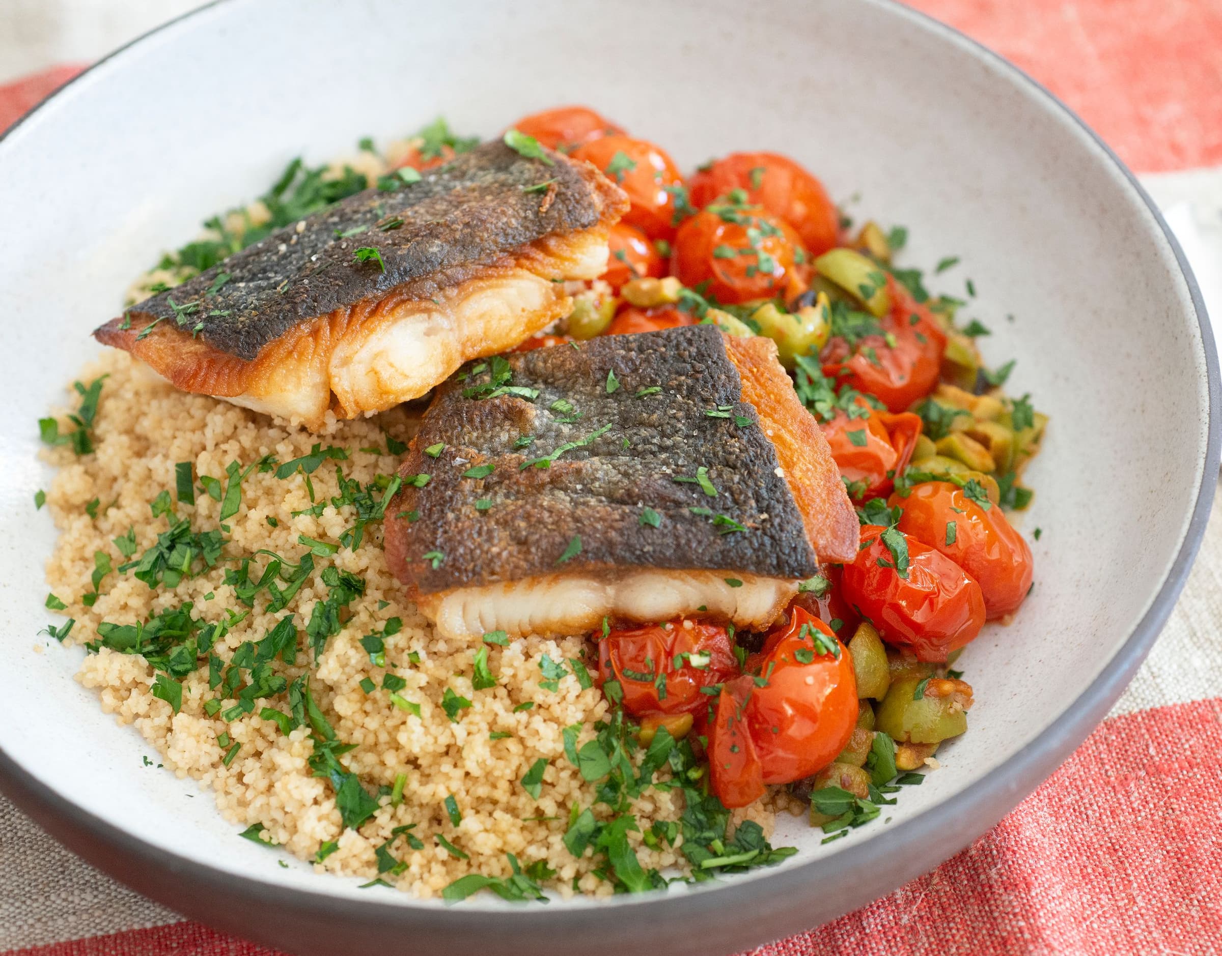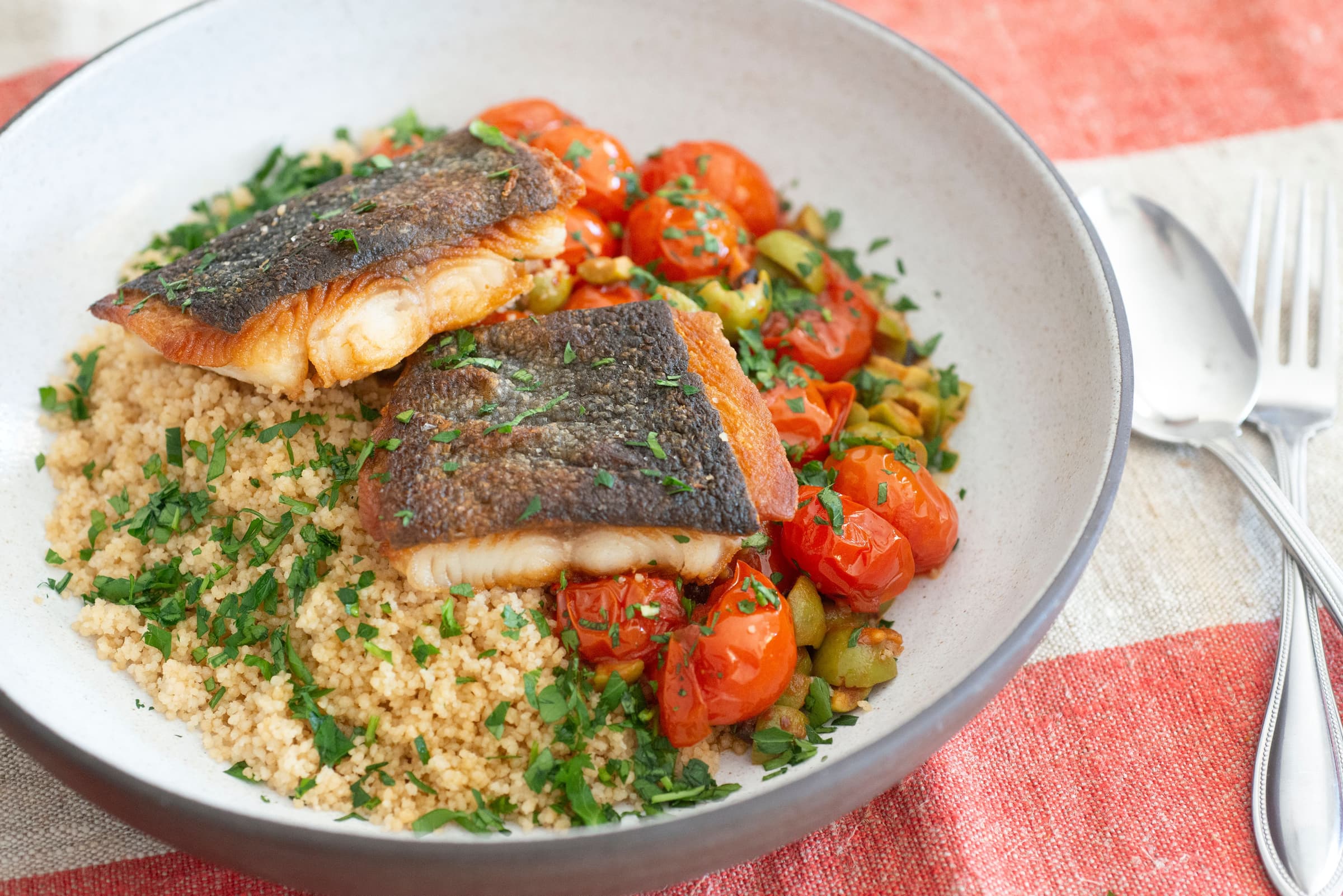 Serve the fish, skin side up, with the couscous and tomato mixture alongside. Garnish with parsley.