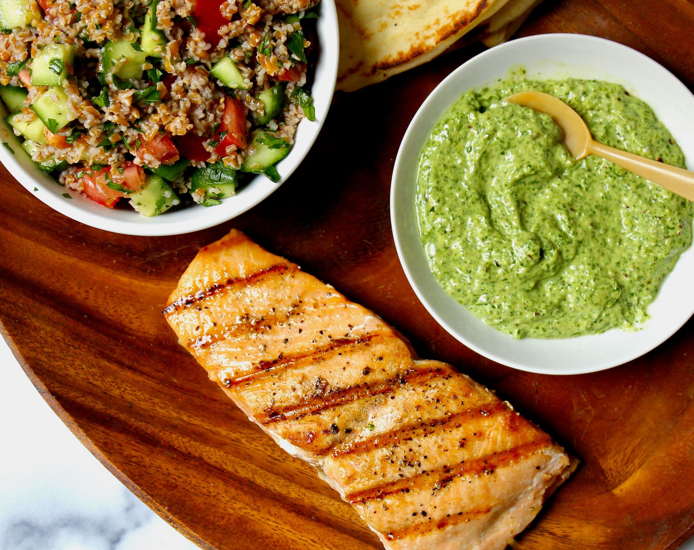 Spoon some of the harissa over the fish and serve the tabbouleh and naan alongside. Enjoy!
