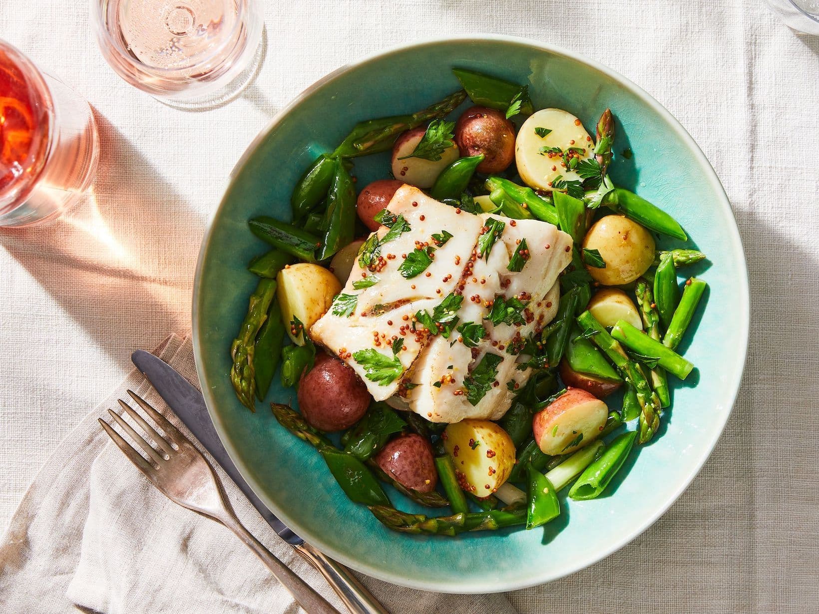 Rich and buttery sablefish (black cod) is pan-seared and then finished in the oven to tender perfection. After cooking, it gets a quick dunk in an herby vinaigrette—called a “post-marinade”—which keeps the herbs especially bright and fresh. Spring veggies are quickly sautéed while the fish cooks and all is done in less than 30 minutes.