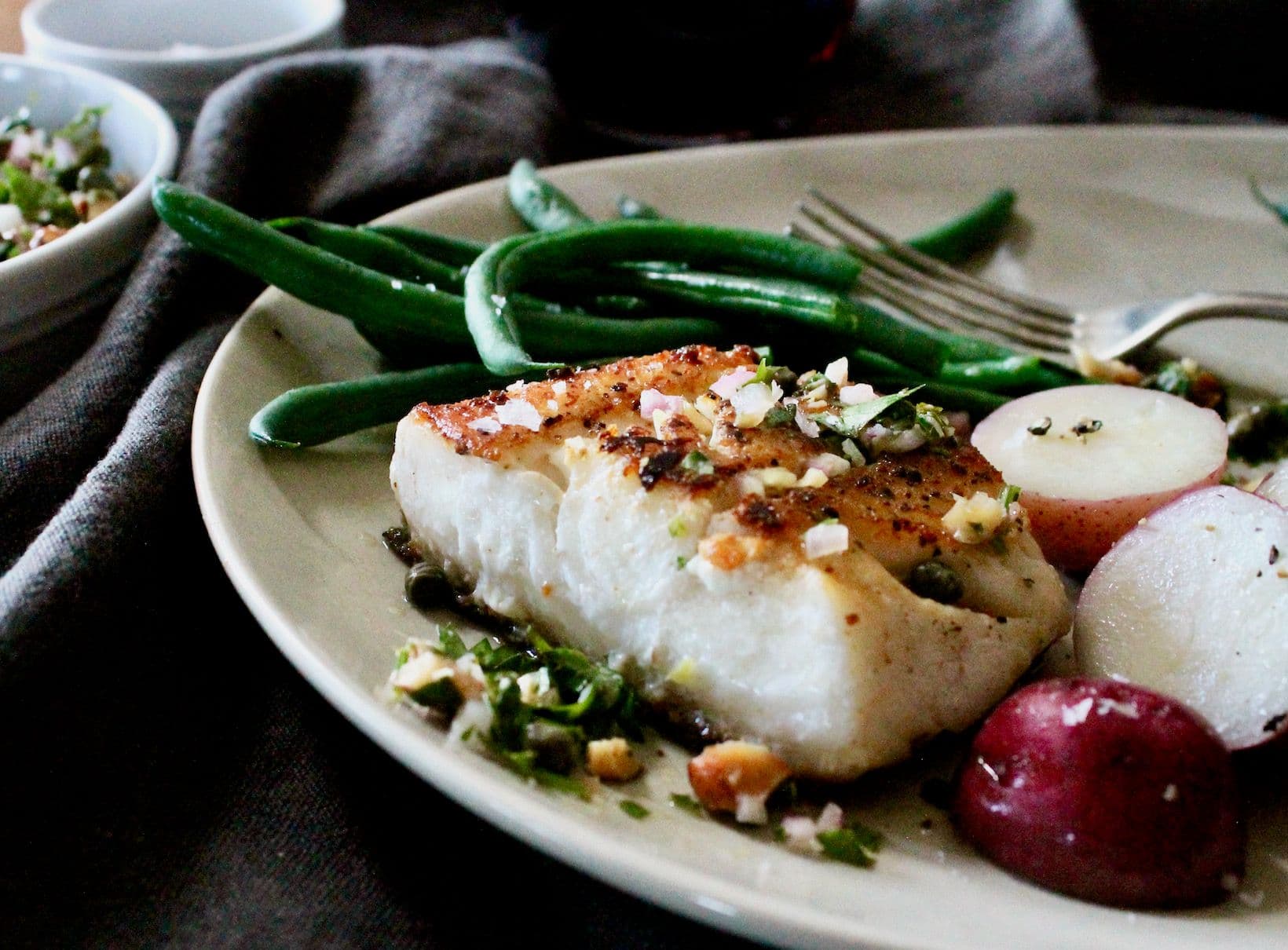 Rich and buttery sablefish begs for a bright and acidic accompaniment for balance, and this fresh herb salsa with lemon and capers fits the bill. Simple boiled potatoes and green beans allow the fish to take center stage.