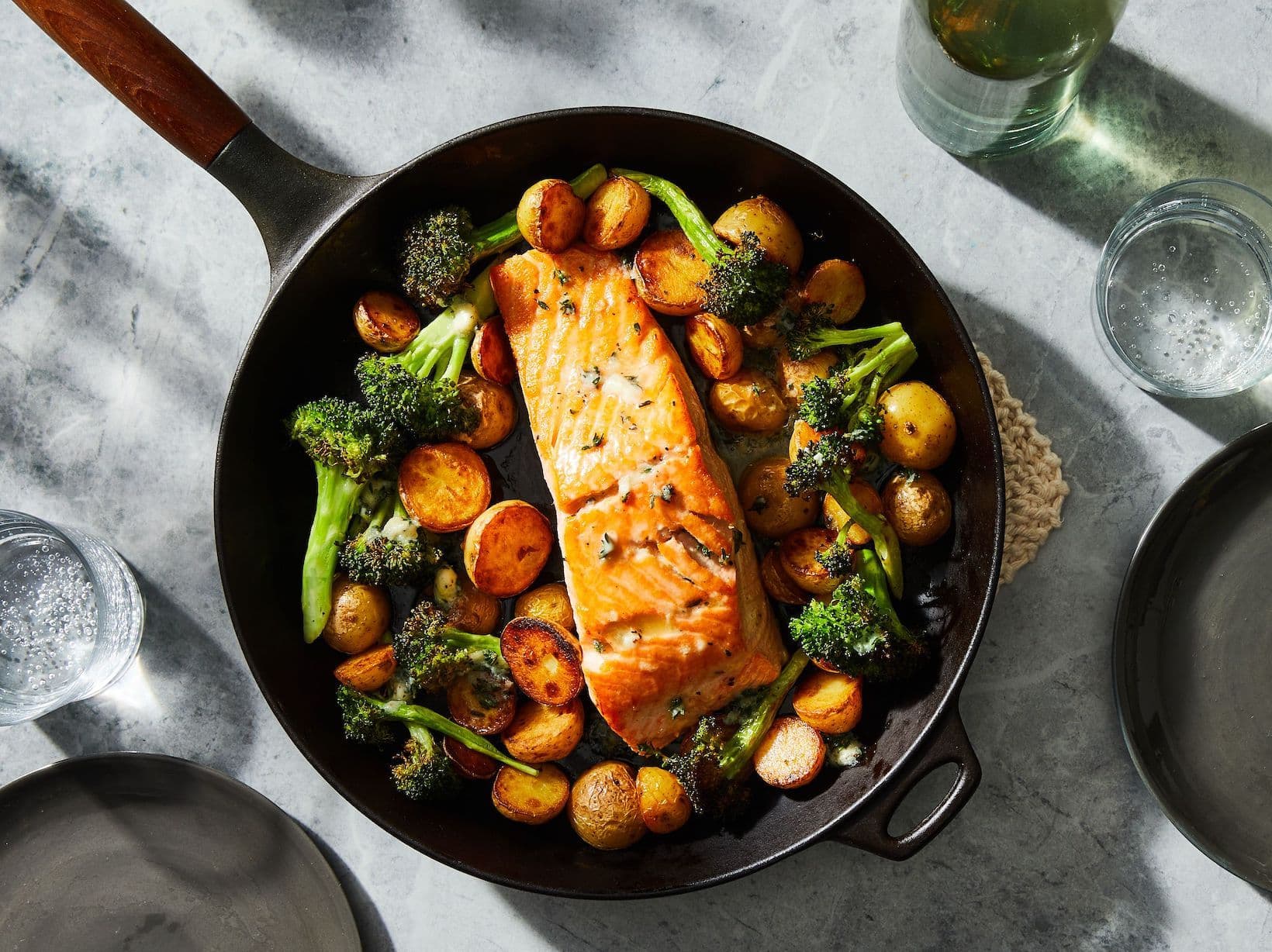 Sheet pan suppers make dinnertime a breeze. Here, the potatoes get a head start in boiling water before being combined with broccoli and salmon on a baking sheet for final roasting. At the end, the veggies are tossed with garlic butter to add richness and flavor.