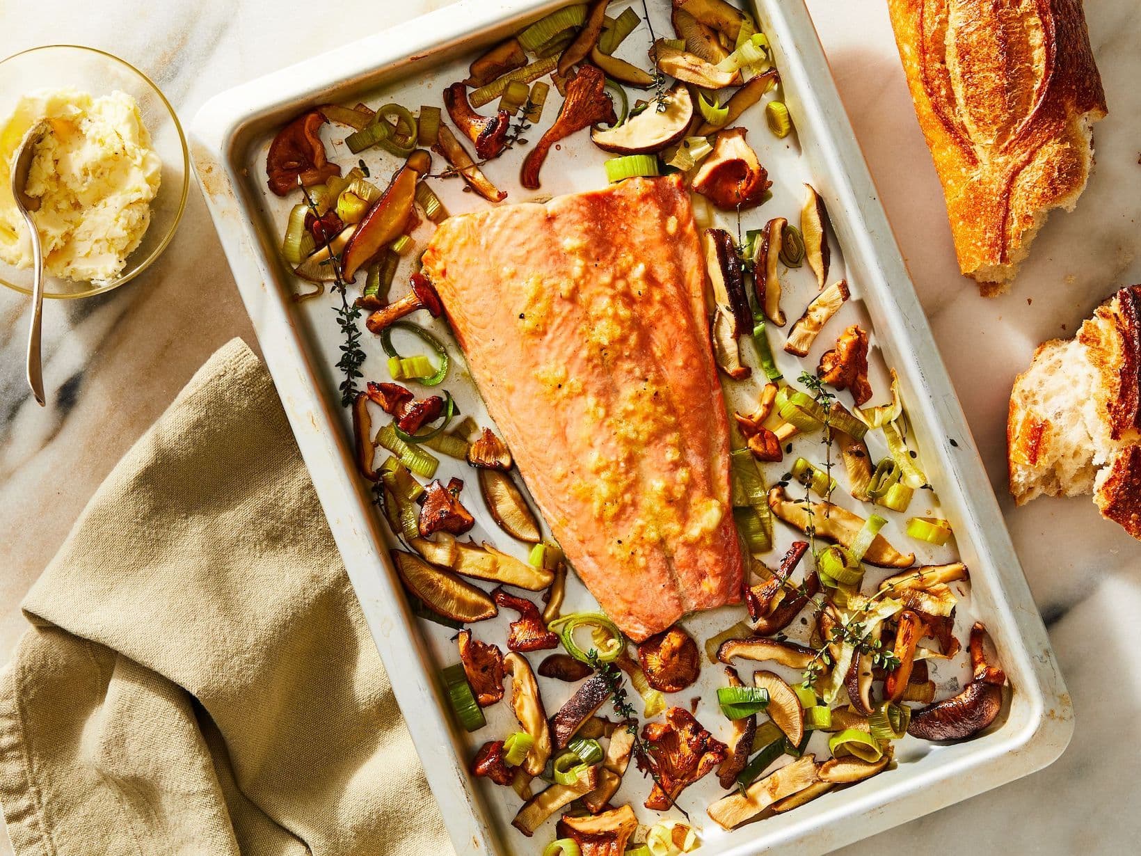 While the salmon and vegetables are baking, in a small bowl, combine the softened butter, garlic, lemon zest, and a pinch of salt and pepper.
