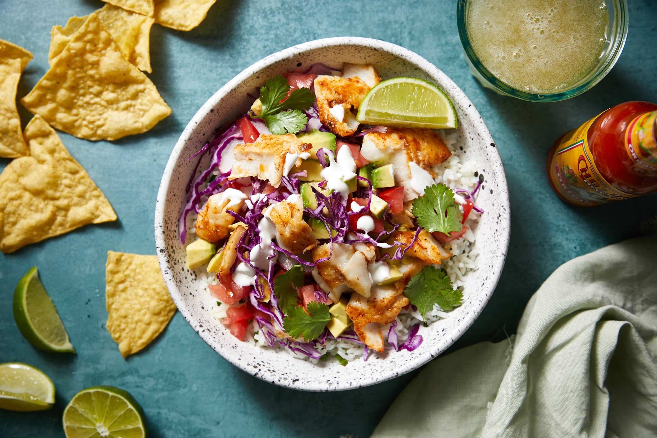 No need to wait until Tuesday for this quick and yummy deconstructed fish taco. Chopped cilantro adds unexpected flair to the rice and lime juice adds brightness to the sour cream. The toppings below are suggestions, but feel free to add your own favorites.