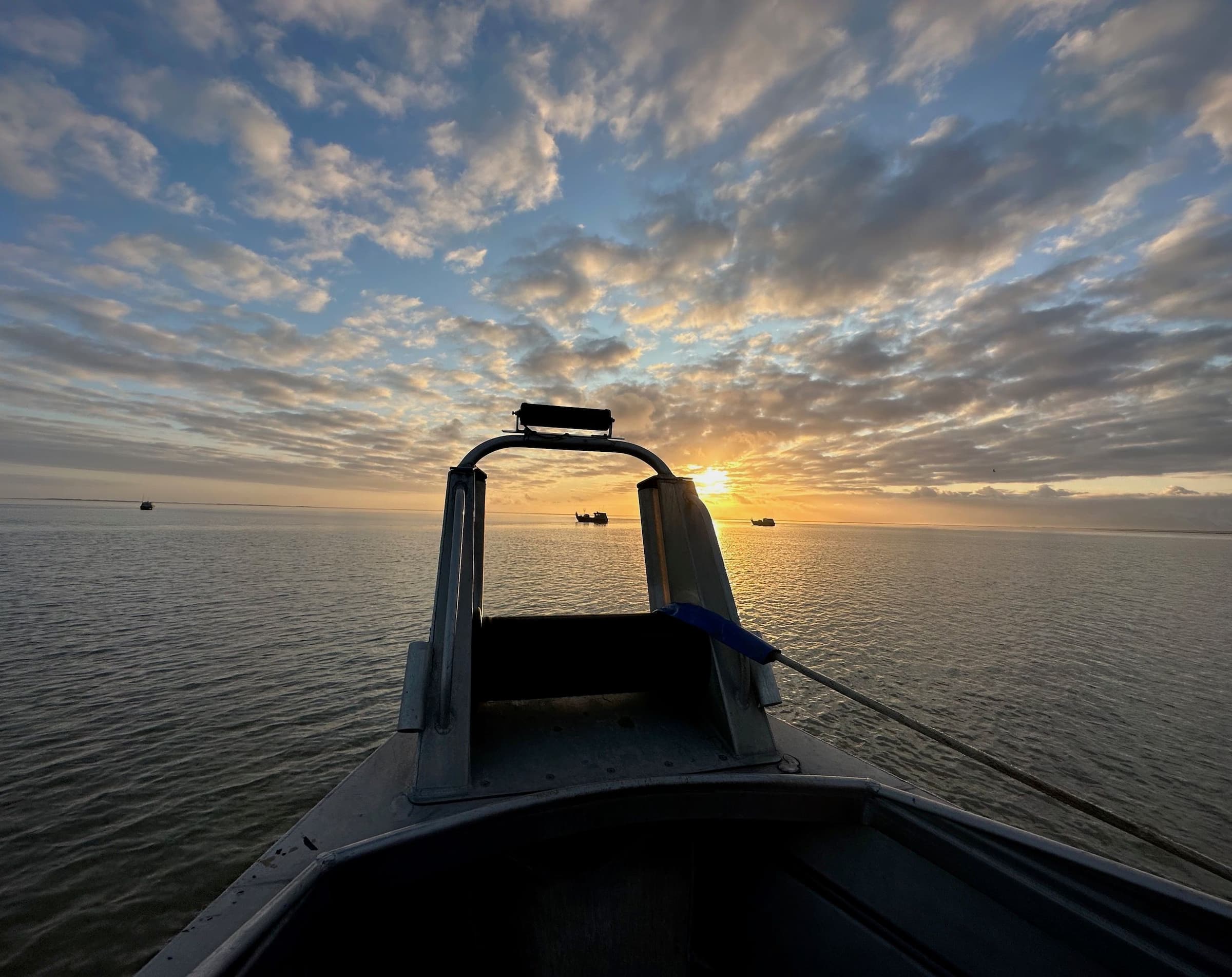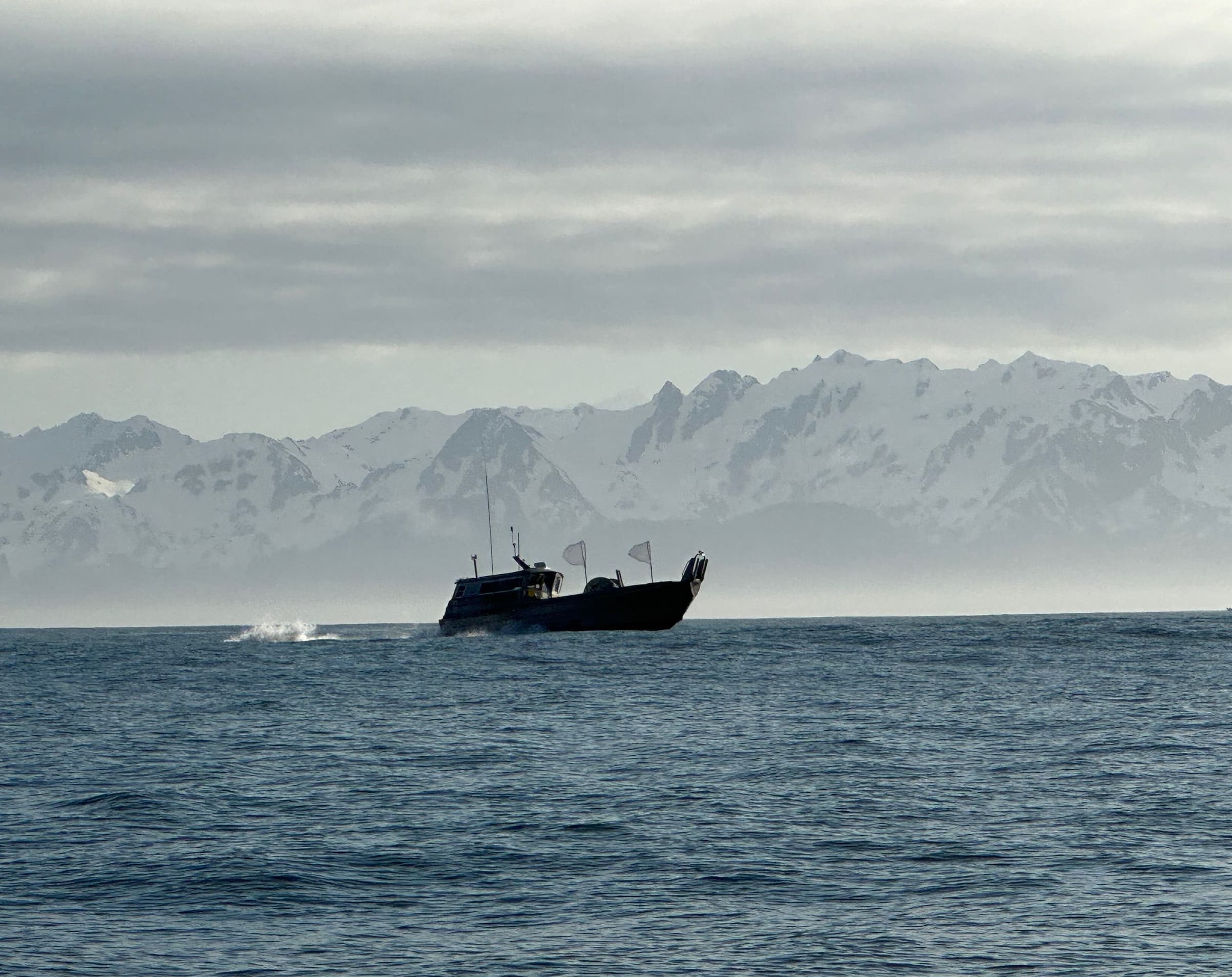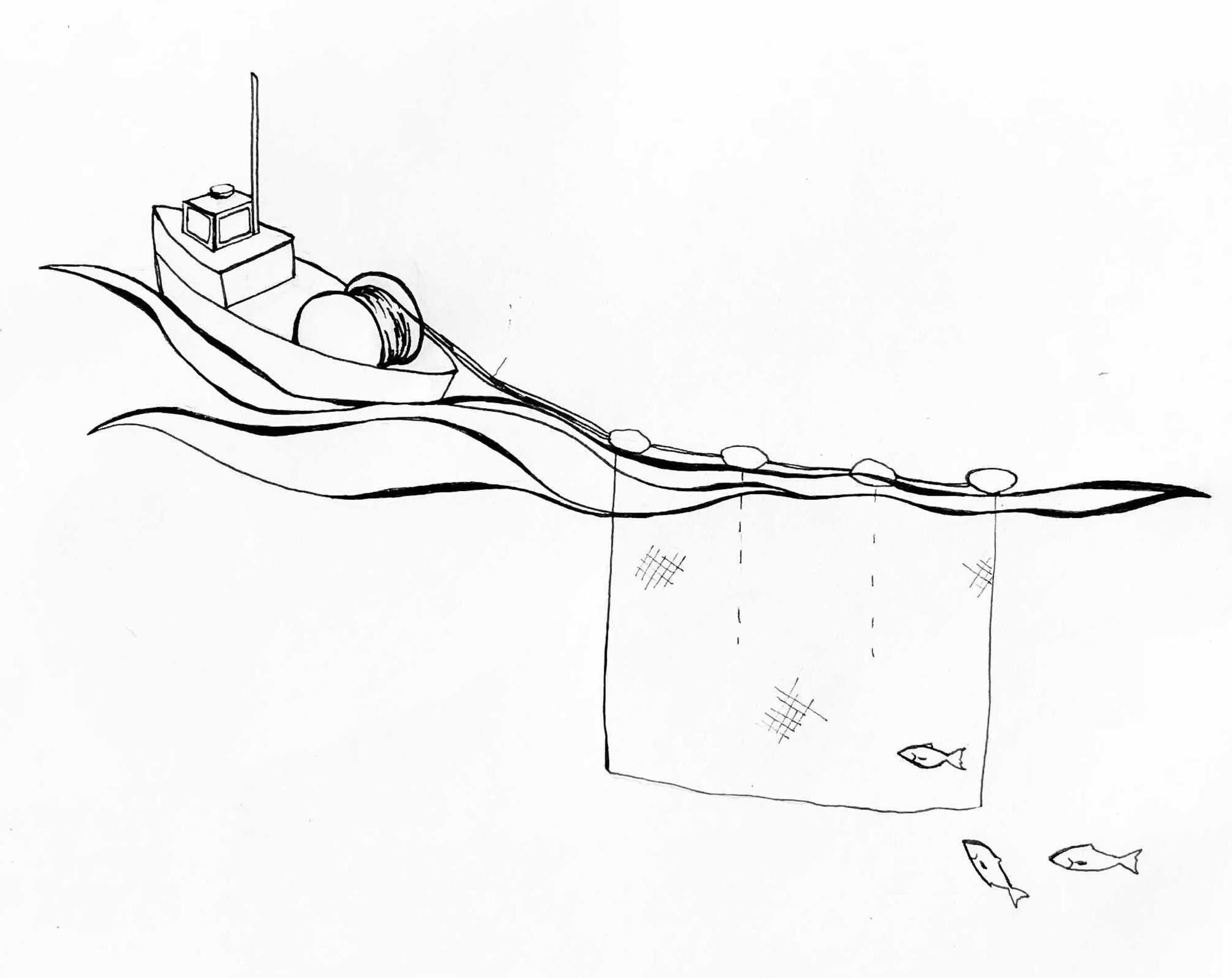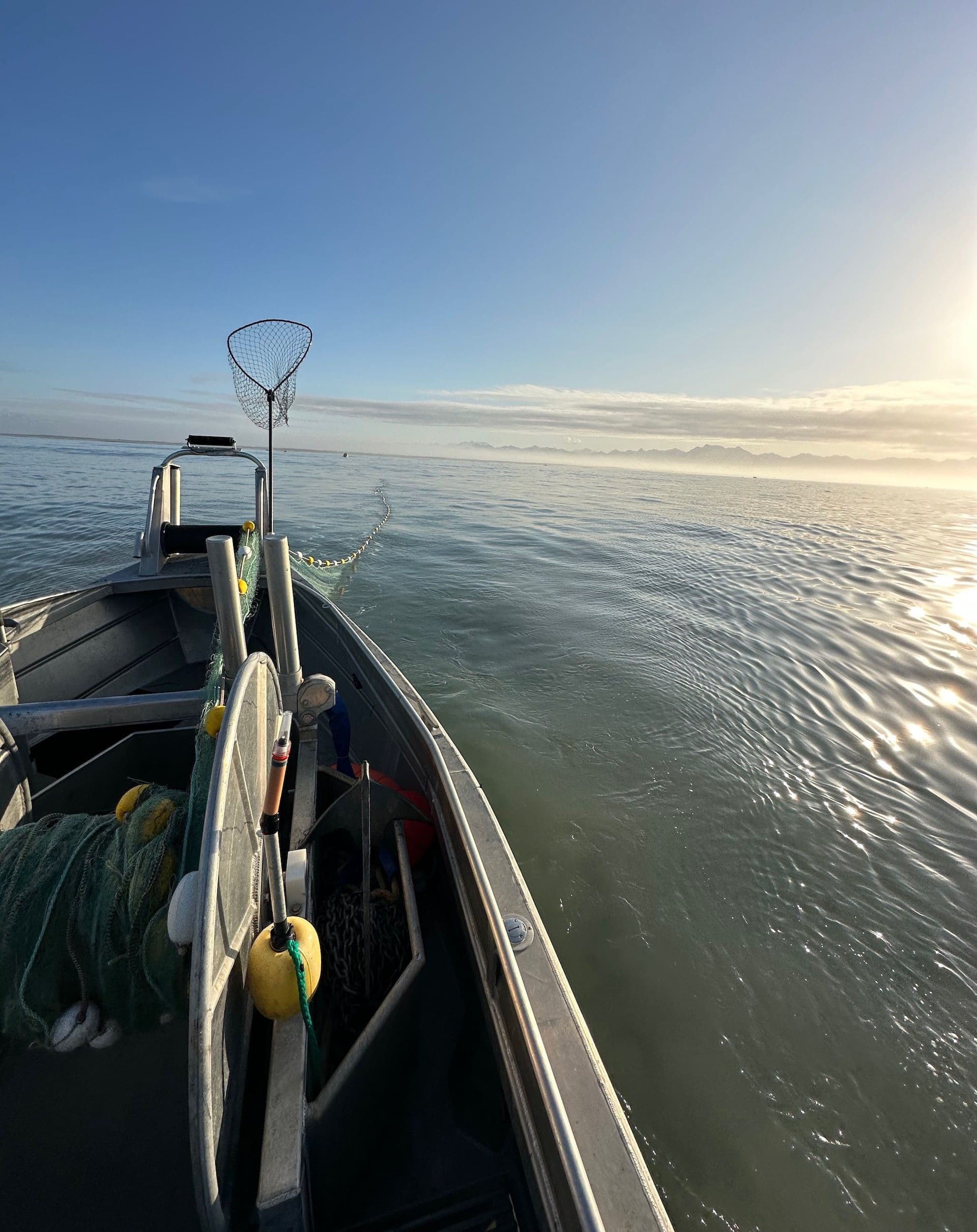 Fishermen set out a large rectangular net that hangs down like a curtain from the surface of the water where the net is attached to a line of floats. While the net “soaks” for about an hour, sockeye salmon try to swim through the curtain. If the salmon are too small to harvest, they swim right through, and if they’re too large to harvest, they can’t enter far enough into the mesh to be caught. But if they are the correct size, their gills are caught in the net mesh. Mesh size restrictions also limit the catch of other non-target species known as “bycatch.”