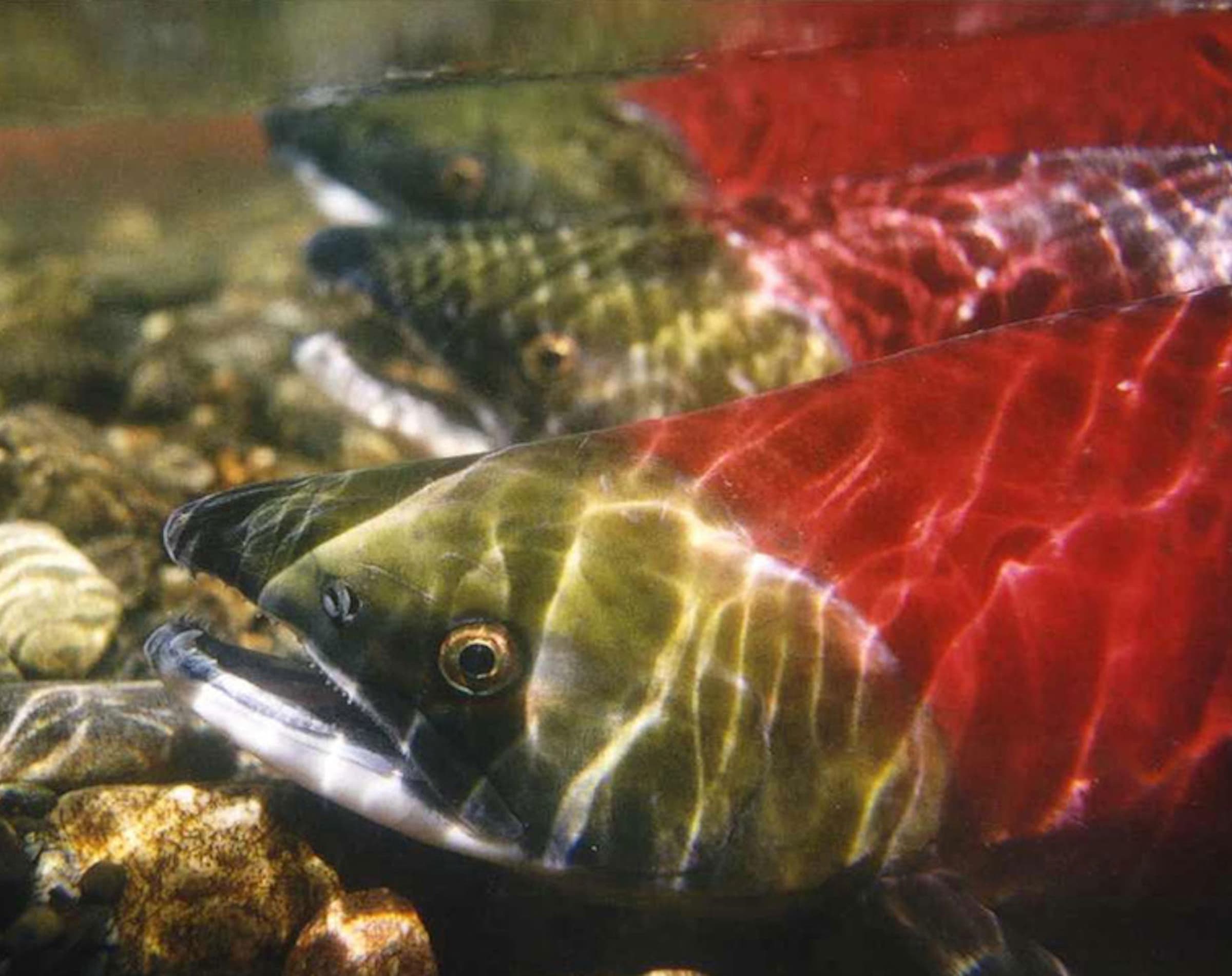 Sockeye’s scientific name derives from the Greek ‘onco’ (meaning hooked or barb) and ‘rhyno’ (meaning nose) which describe one of salmon’s most iconic morphological changes: male's pronouncedly “hooked” or enlarged nose, as well as a curved and snaggly-toothed lower jaw called a “kype" that develops when they swim upstream to spawn and later die.