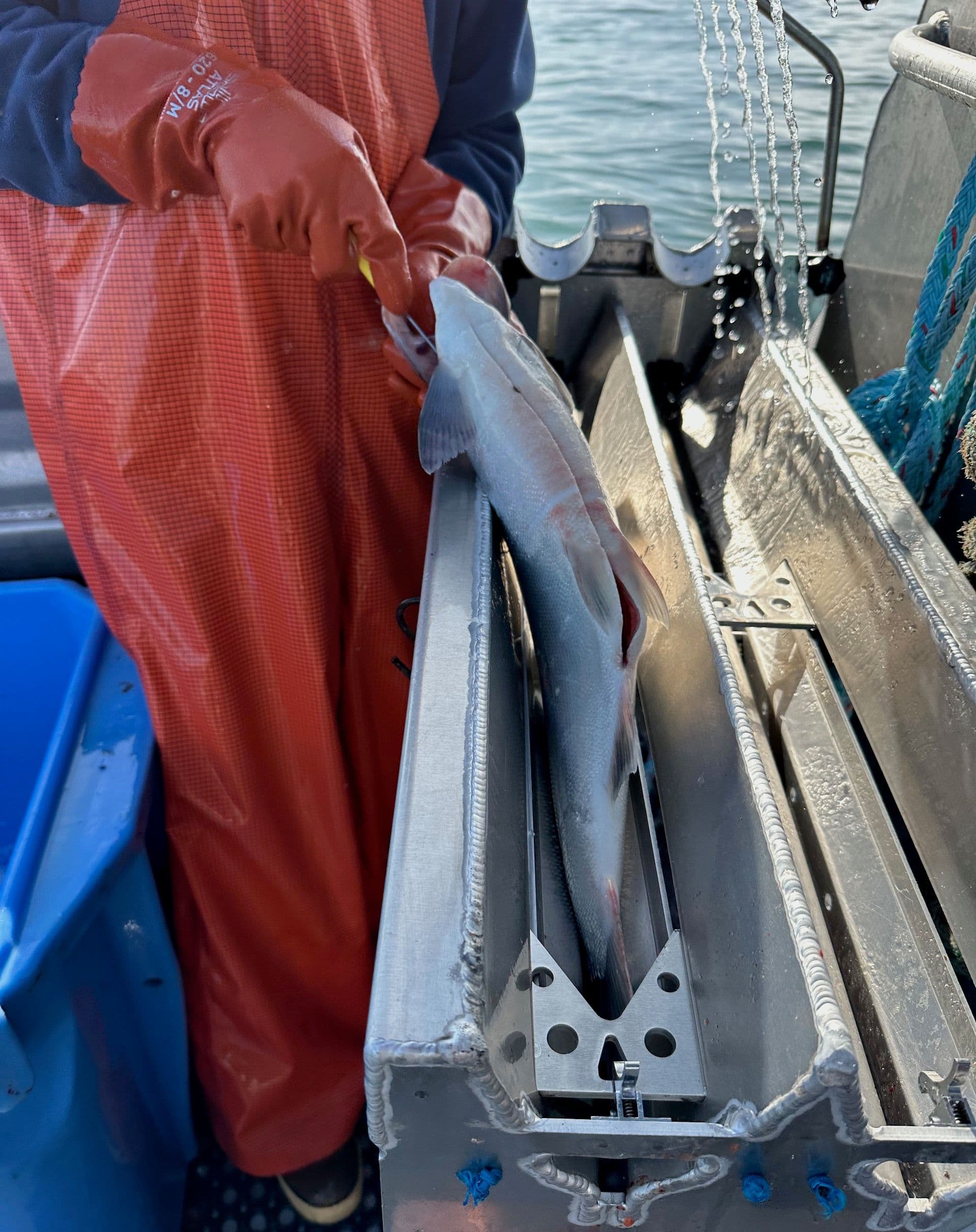 The fish that are caught are then hauled in to the boat so fishermen can untangle each slippery fish before picking them out of the net one by one and immediately bleeding and chilling them.