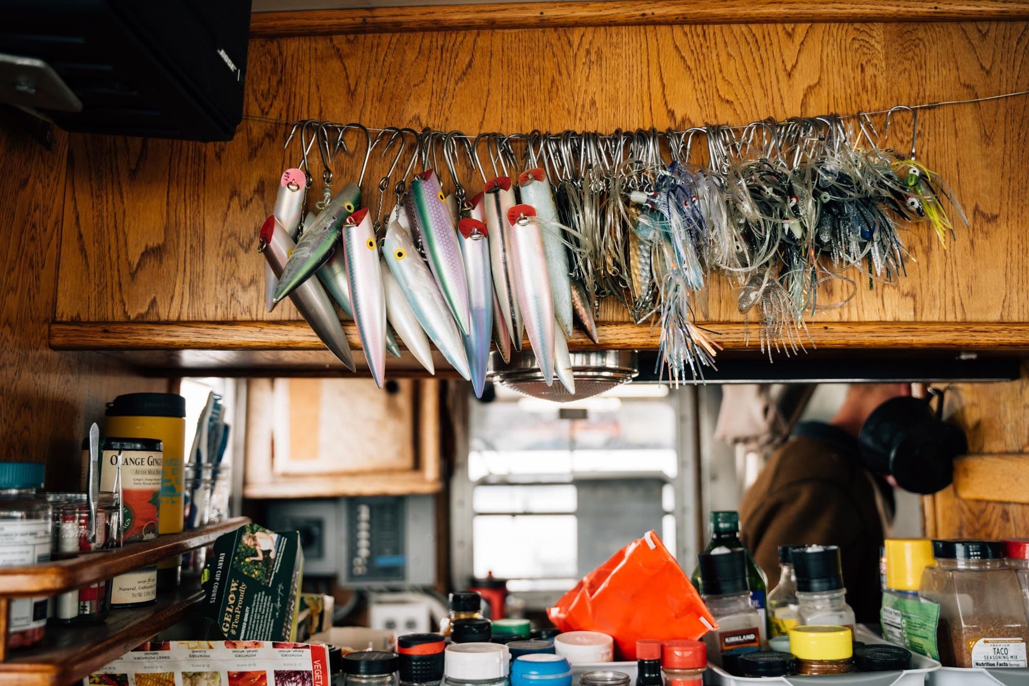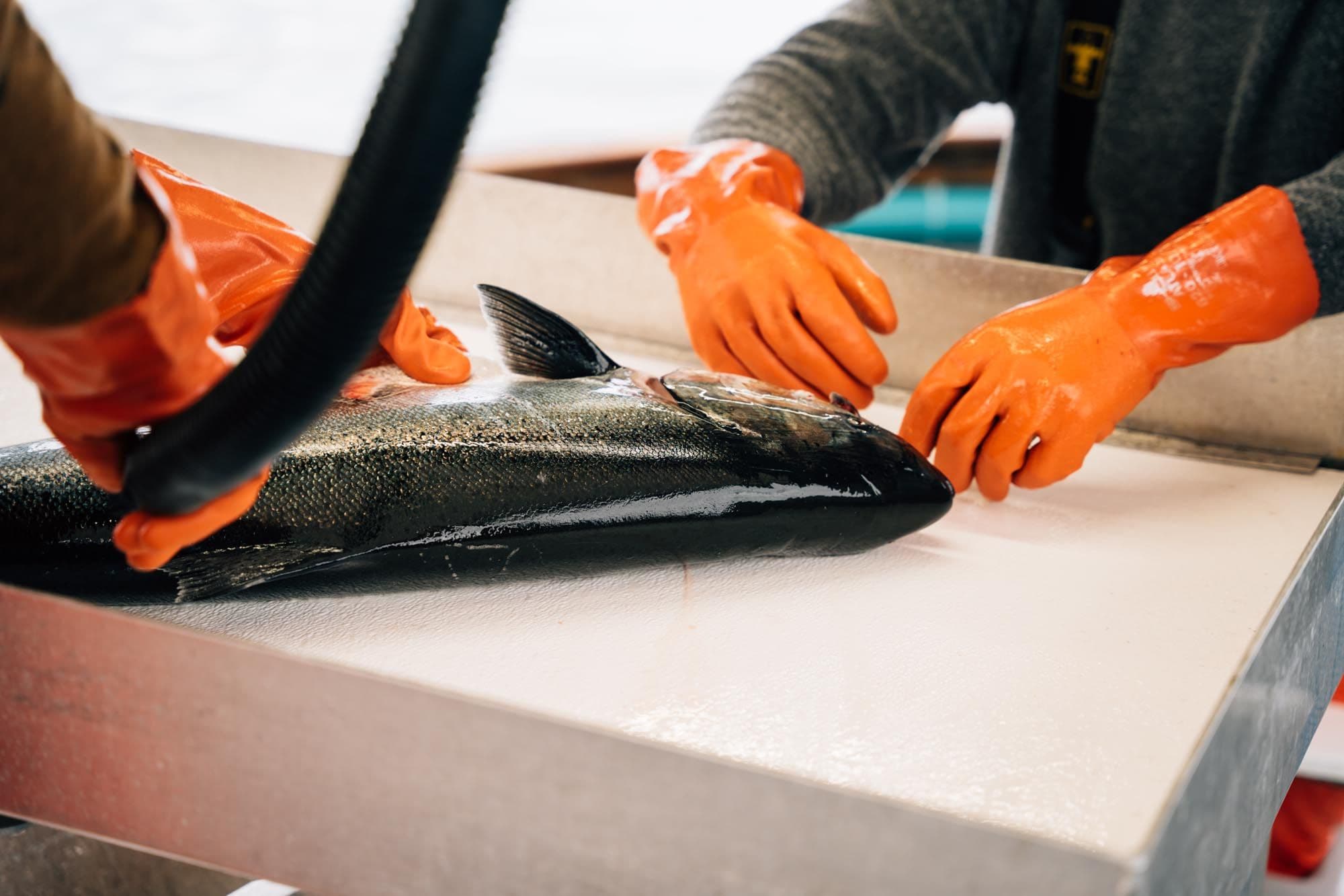 As we chat, Ben watches the lines out of the corner of his practiced eye, waiting for the subtle tug that signifies he’s caught something. We get one tug, but the fish is below regulation at under 28 inches, so back in the water it goes. Then more movement, and this time it’s a keeper. Ben reels the line in and uses a net to scoop up the thrashing salmon. Once on the deck, he stuns the fish on top of its head just behind the eyes to induce immediate unconsciousness, which reduces suffering and maintains the quality of the meat. He cuts behind the gills and inserts a tip into the artery to flush the blood out, which ensures a cleaner product. He then moves the fish over to a processing counter, slices open the belly, removes the guts, and then vacuums the fish for any little tidbits such as sealice. Then he douses the fish in water, a process known as glazing, which locks in moisture and minimizes exposure to air, before lifting a metal covering and disappearing into the belly of the boat, where he deposits the fish into the 10,000-pound-capacity freezer. Blast-freezing the fish immediately is another crucial step to preserve flavor and freshness, all part of a process designed to ensure each fish arrives to customers in its most pristine state.