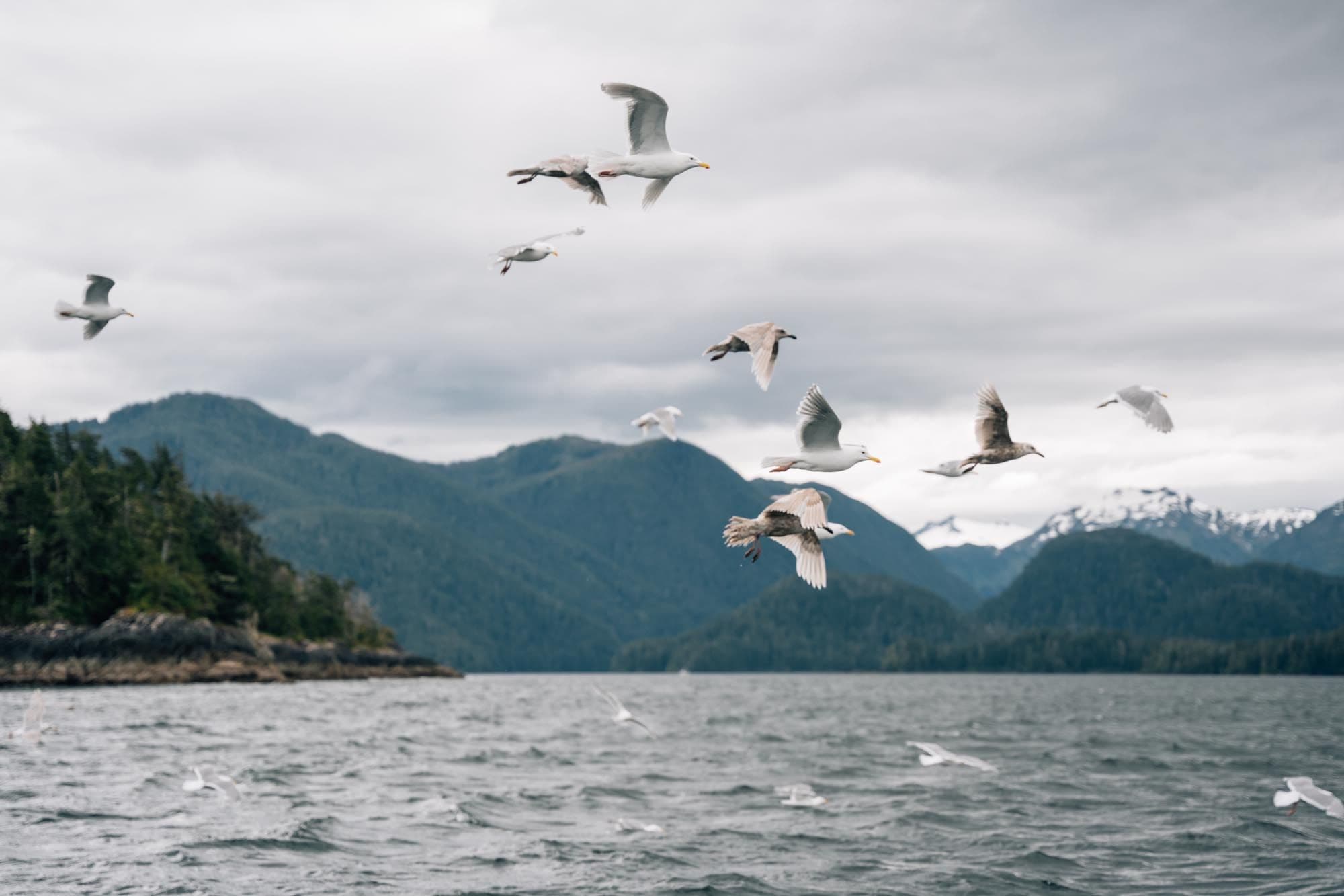 The water that spread out before us as we left the harbor was remarkably placid. In the foreground, rocky islands rose, dense with Sitka spruce and red alder, with the occasional house glimpsed through the trees. In the distance, snowcapped peaks melded with pale gray clouds. Bald eagles, maybe the pigeon of Alaska, dove from the sky or perched on steel frames on breakfast surveillance. We saw a whale blow and an otter dive. For Marsh, it was just another day at the office.
