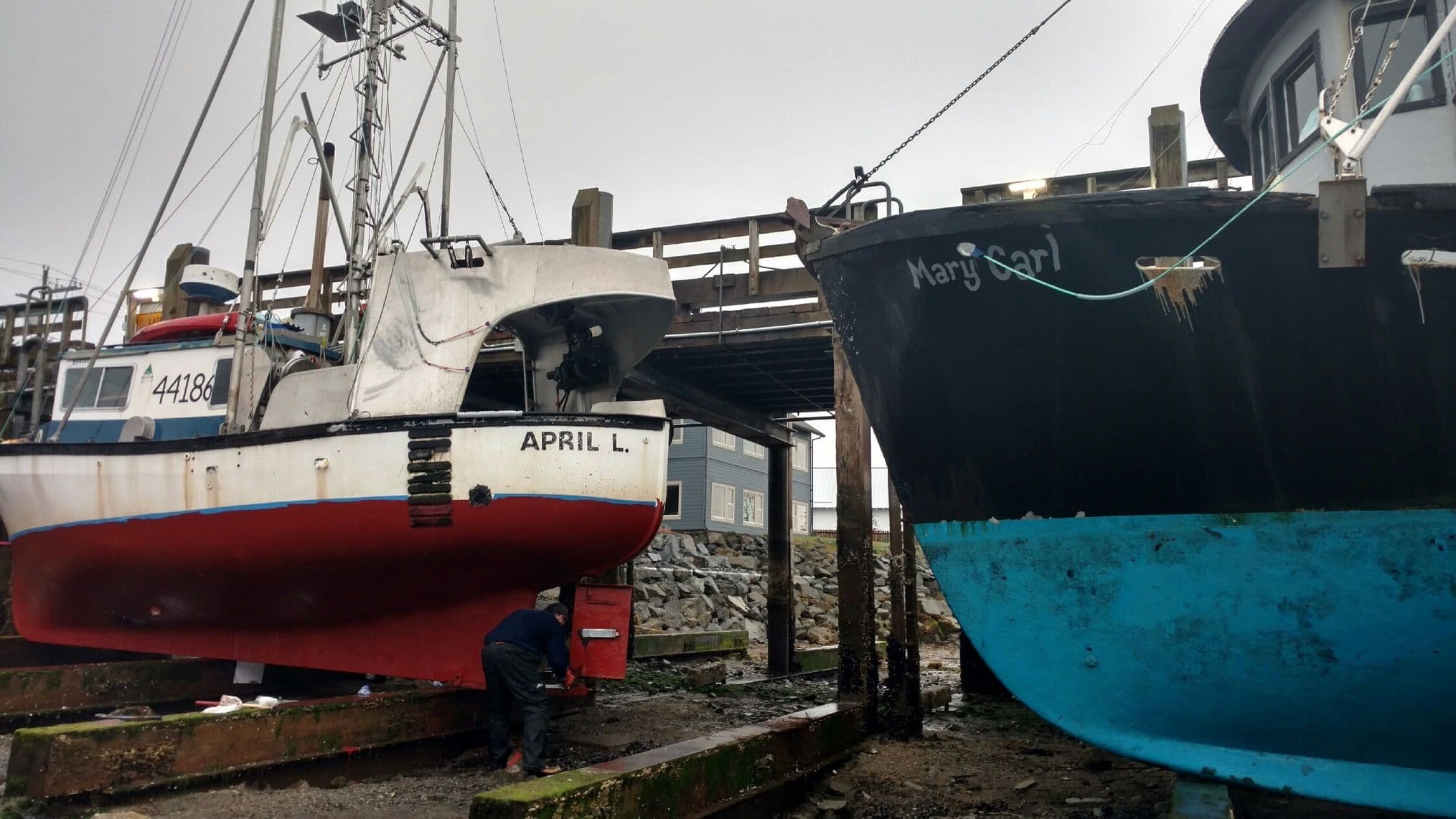 Sometimes boat projects require services that can’t be completed by the captain alone. Cleaning the bottom of your boat improves efficiency, allows you to replace zincs, which are sacrificial metal anodes that protect boats from electrolysis. There is also time to inspect the prop, rudder, and make sure everything looks good before going back in the ocean. . There are also fittings that allow water into the boat for cooling hoses and for washing down the back deck. These can’t be serviced while you’re afloat, since you might spring a leak and sink at the dock. These repairs require the boat to be hauled out. Commercial fishing boats are too heavy for trailers like many smaller recreational vessels, so haul-outs use a travel lift with heavy-duty straps to lift boats out of the water. These lifts must be able to handle boats weighing up to 80,000 pounds. It’s no small feat; it requires specialized heavy equipment and operators you can trust to keep your boat from tipping over on shore. The alternative is the “grid,” where you tie your boat to a ramp and work on it in a short tidal window. This works for quick repairs, but if something goes wrong, time and tide wait for no one. There is also danger of your boat tipping over and it’s difficult to paint a boat that's just out of the water.