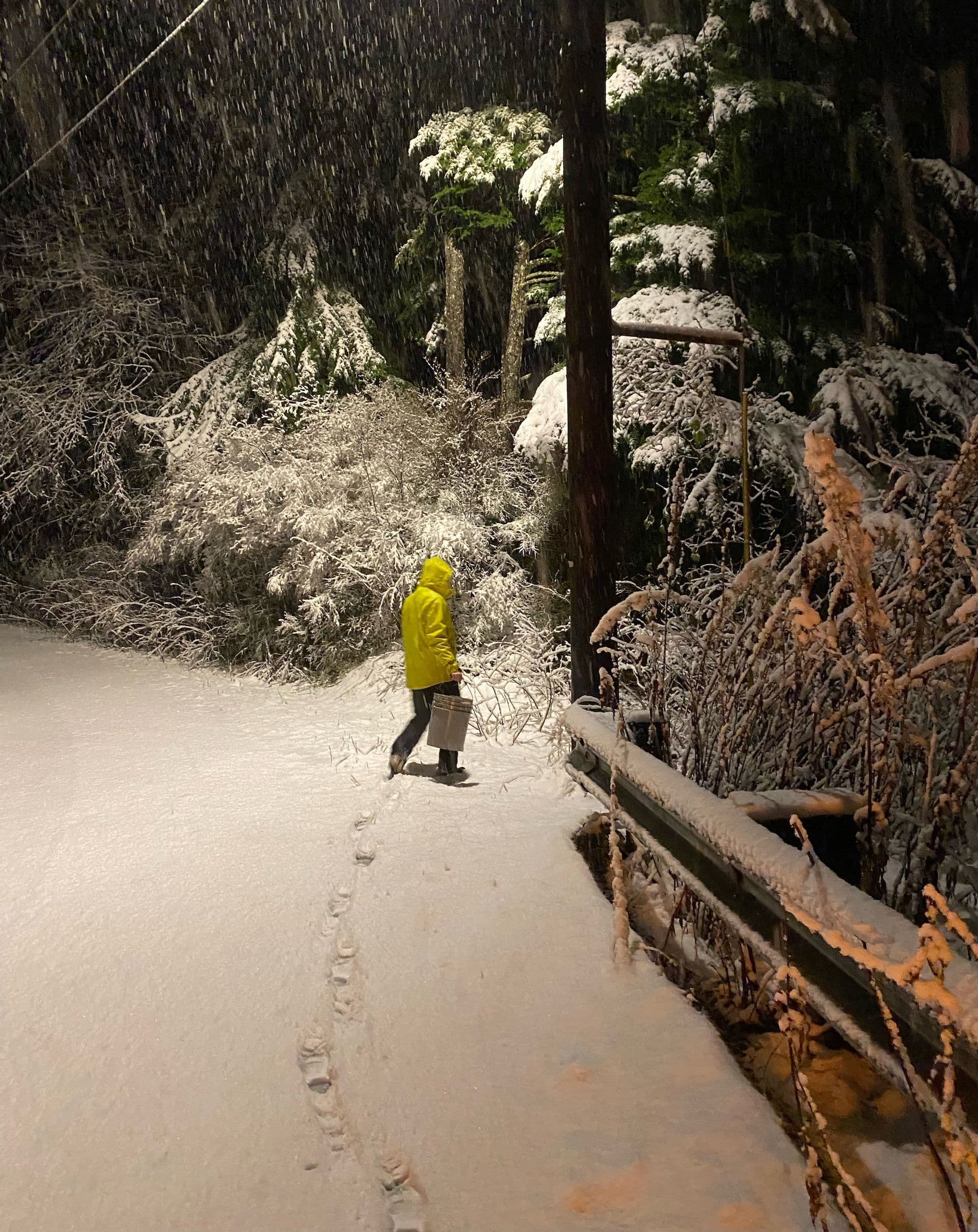 We carried the now-heavy buckets back towards the snowy road and slowly, very slowly, drove back into town commenting on the beautiful spruce and hemlock trees that were newly laden with fresh snow.