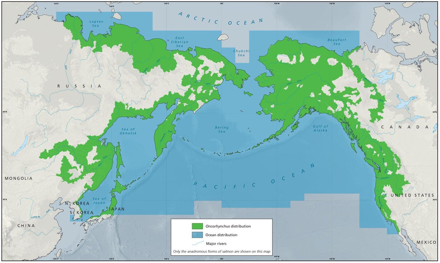 These two strategies have profound impacts on both ecology and human culture. As human populations migrated from East Asia to North America, they would have been familiar with most of the salmon species they found. Pacific salmon populations inhabited environments in a wide arc across the North Pacific, from the Korean peninsula and Japan in the west, to the Arctic Circle in Siberia and Alaska in the north, and down the coast in North America all the way to the present day border of Mexico. Their anadromous habit pushed salmon 1,000 miles or more upstream into the headwaters of mighty rivers like the Yukon, Mackenzie, Fraser, and Columbia.