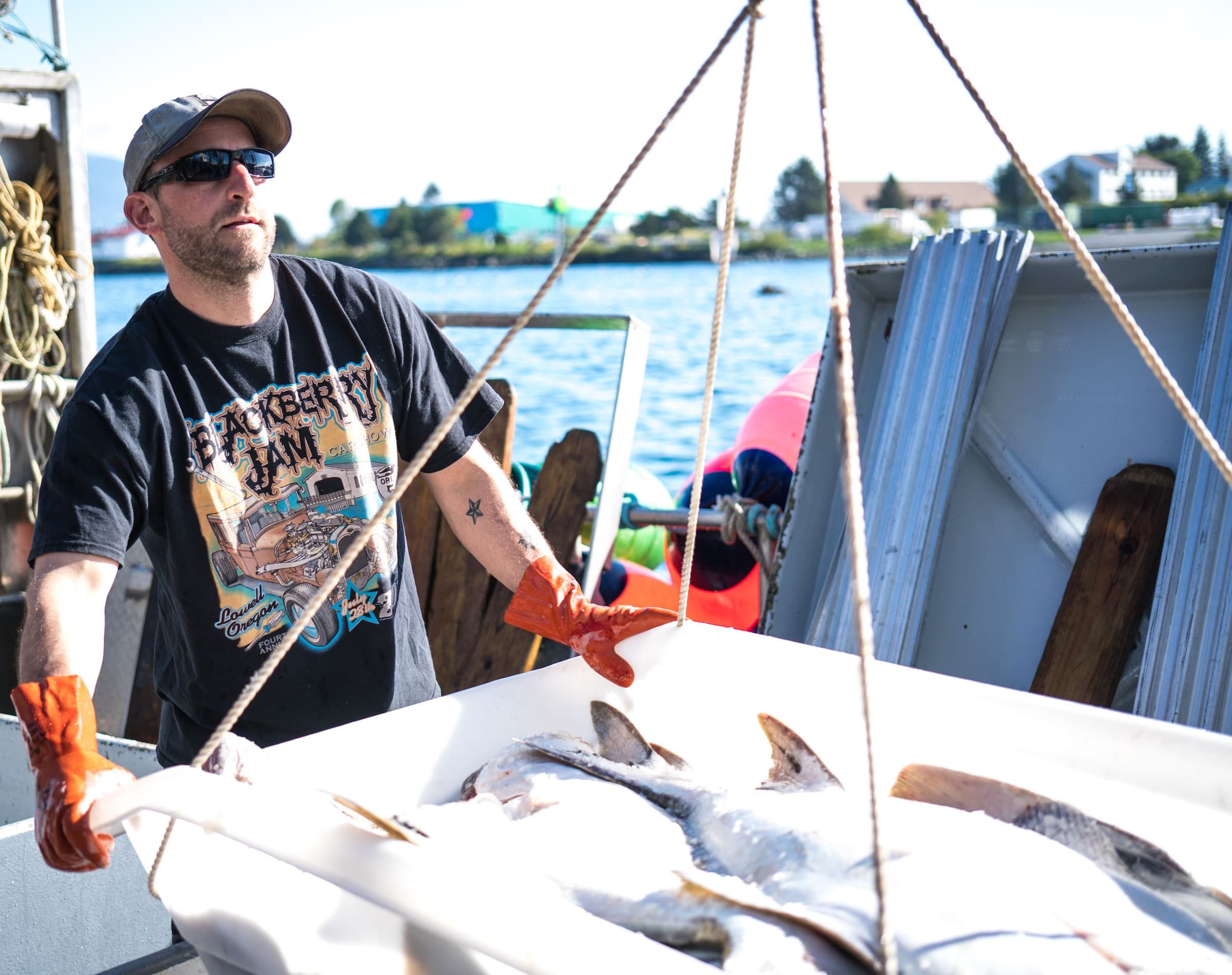 Whether he’s caught salmon, halibut, or sablefish, every fish passes through three stages. First, a fisherman hauls them aboard and removes them from the gear. Fishermen then place the fish in a check tote, where the fish are chilled and bled to preserve freshness. Next, they’re moved down into the fish hold. Here they are kept cold until they are unloaded at the dock or a fish tender arrives to pick them up for transport back to the fish plant for processing into the portions and products that fill your box every month.