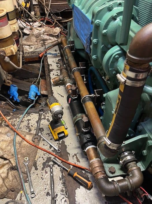 Replacing the main engine in a wooden troller is no small task. While a well-maintained engine can last up to 20,000 hours, replacements can become inevitable over time. The job requires cutting into the boat’s structure to remove the old engine and install the new one, along with disconnecting and reassembling a network of critical systems. These include the hydraulic lines for the anchor, cooling systems, electrical wiring, battery banks, steering, and exhaust — all packed tightly into a cramped engine room beneath the wheelhouse. It’s a complex, physically demanding process.