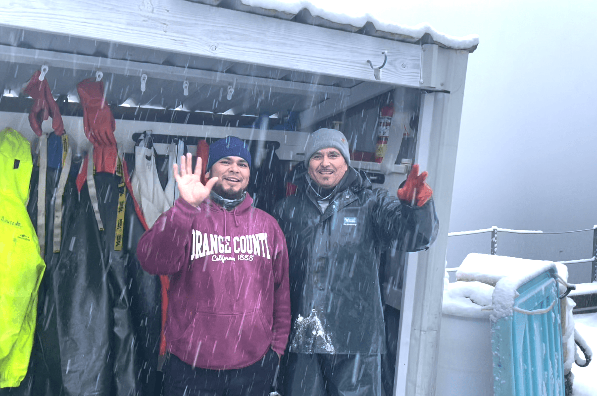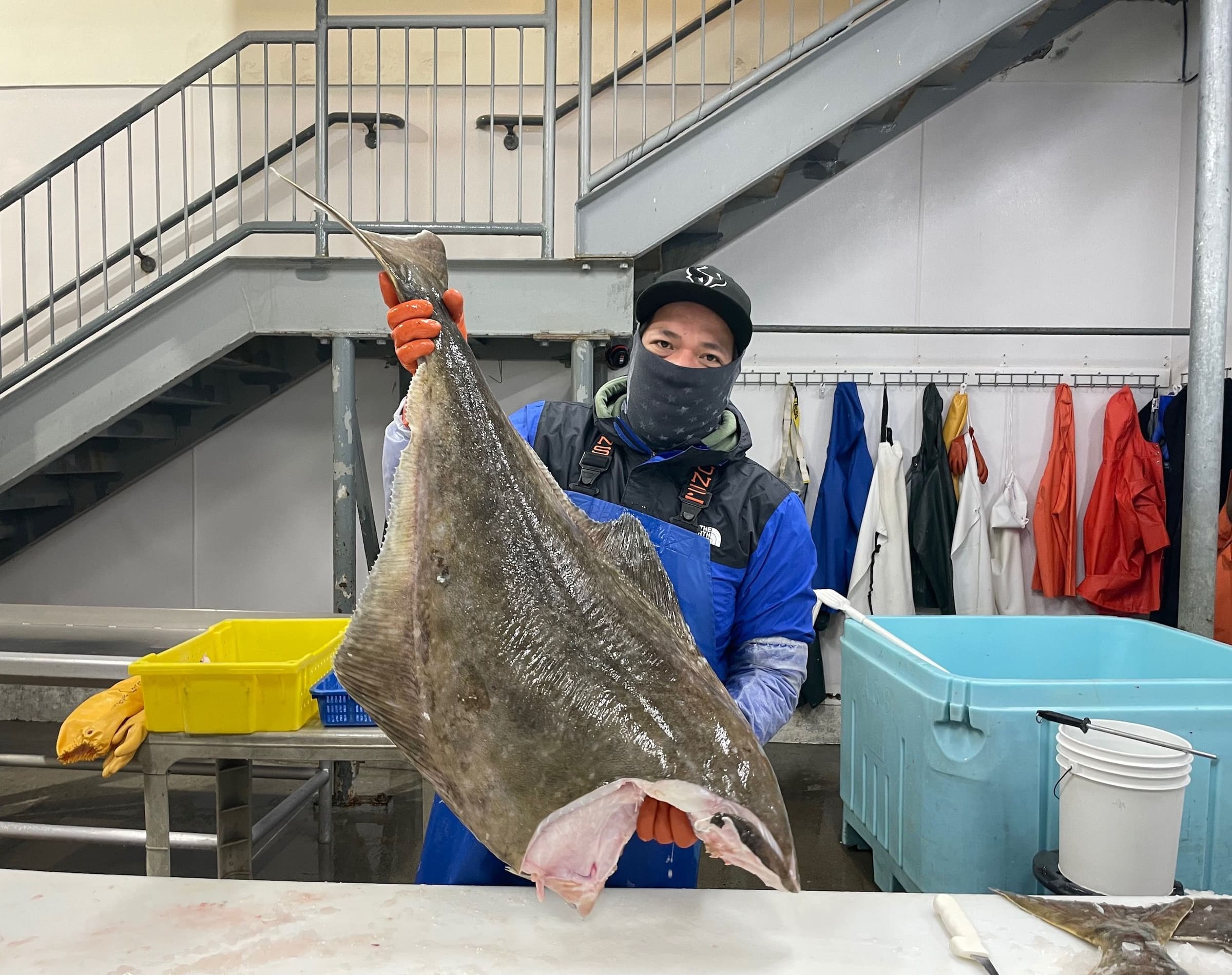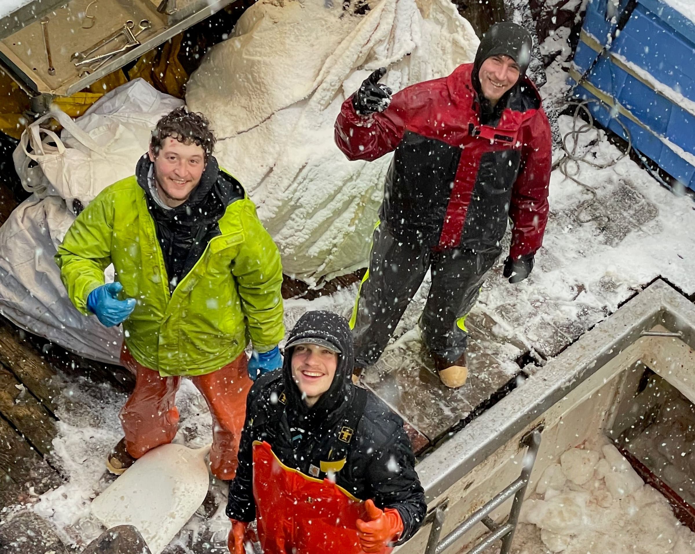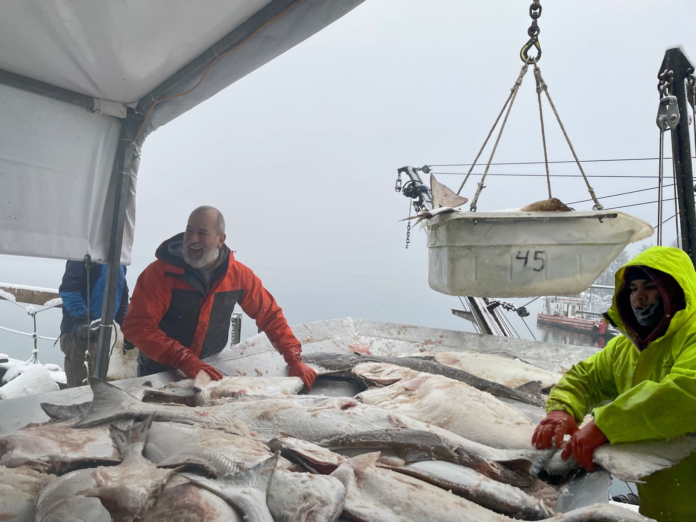 We joke around while Leo, the dock lead, works with Peter on the crane to offload the last load for the longline season from the F/V Carlynn before it’s filleted, portioned, and blast–frozen. As the snow falls in big wet clumps there’s a zing of energy in the air.