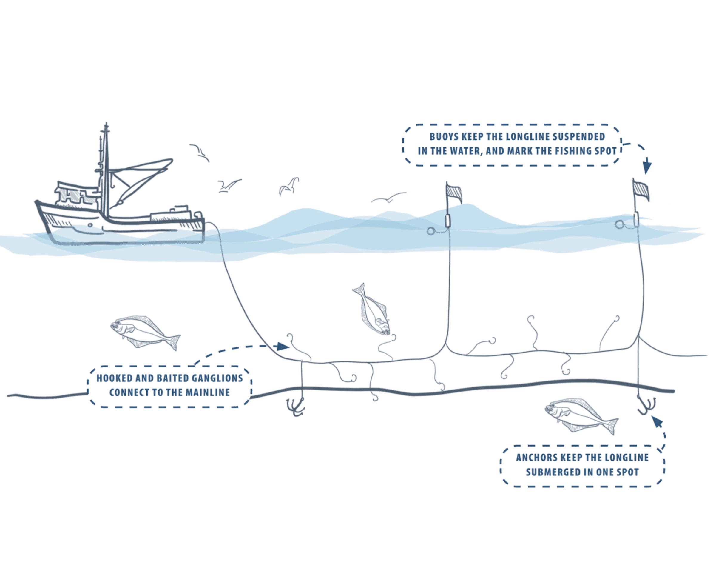 A longline is a weighted line strung with baited hooks spaced about a dozen feet apart on pieces of line called “ganglions.” These ganglions attach each hook to the main longline.