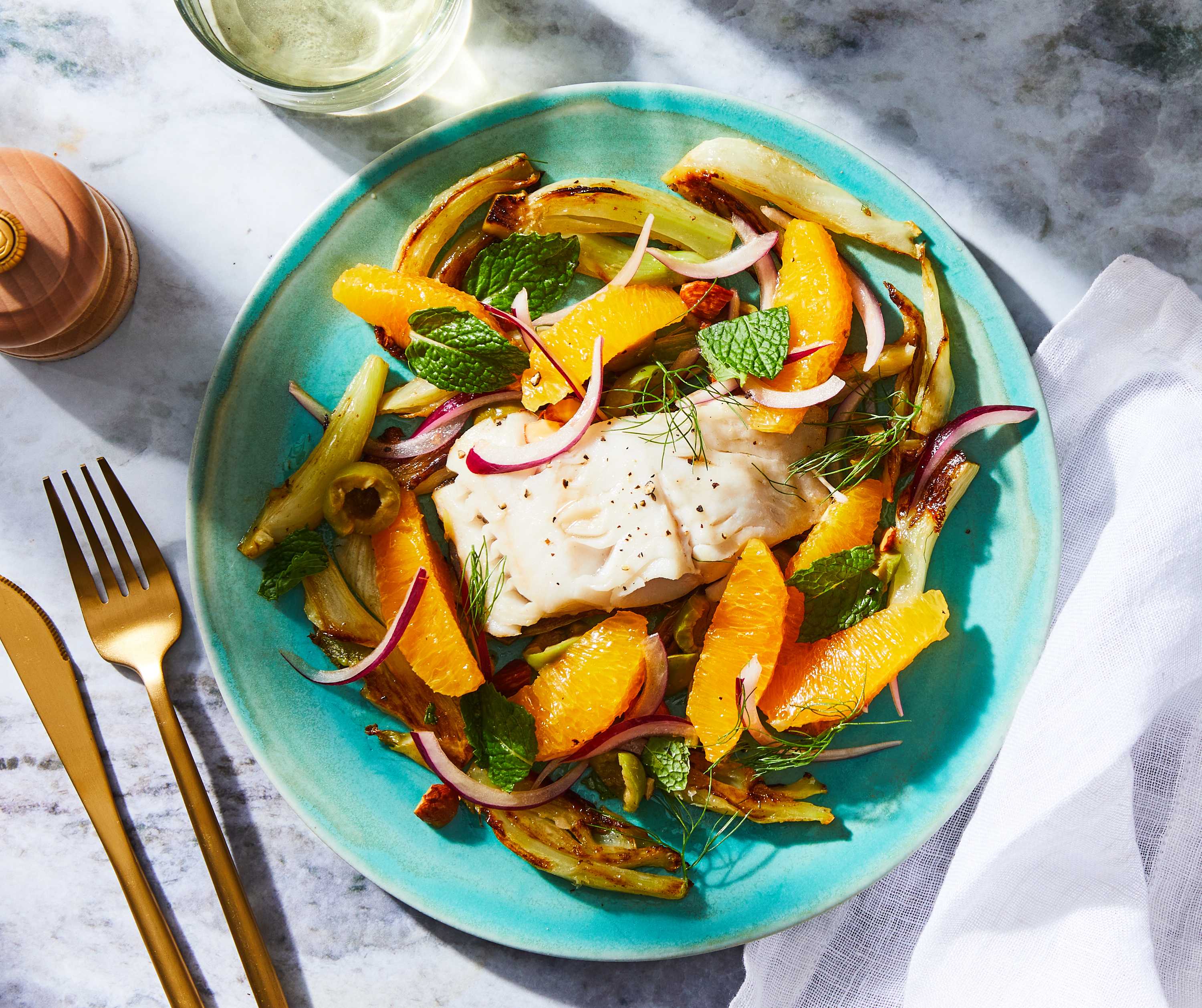 Fennel and orange are ubiquitous in Sicilian cooking. Here, the fennel is roasted alongside buttery sablefish until tender and served with a sweet-tart orange and toasted almond dressing. Fresh mint is a revelation here, but parsley is a fine substitute.