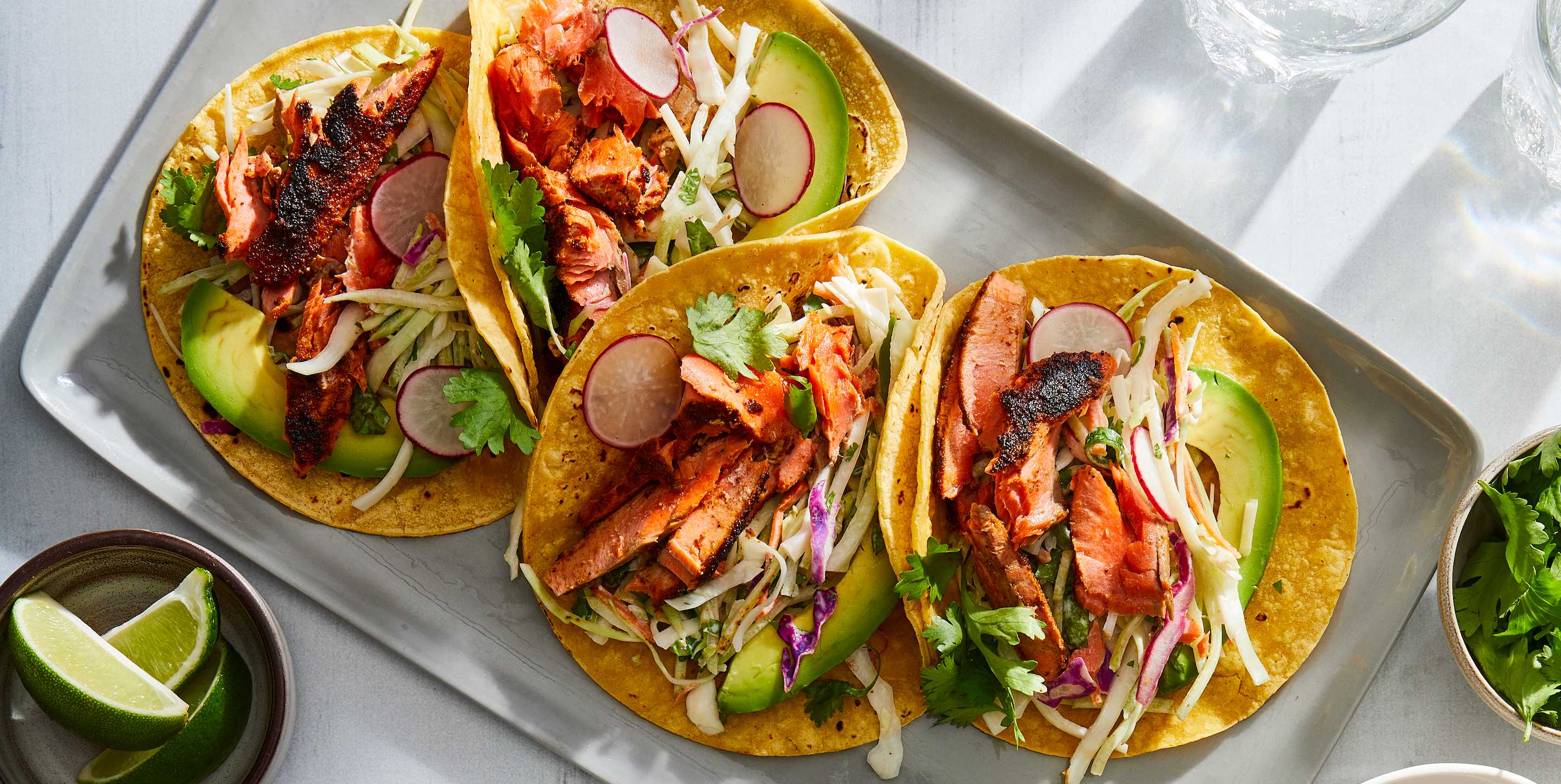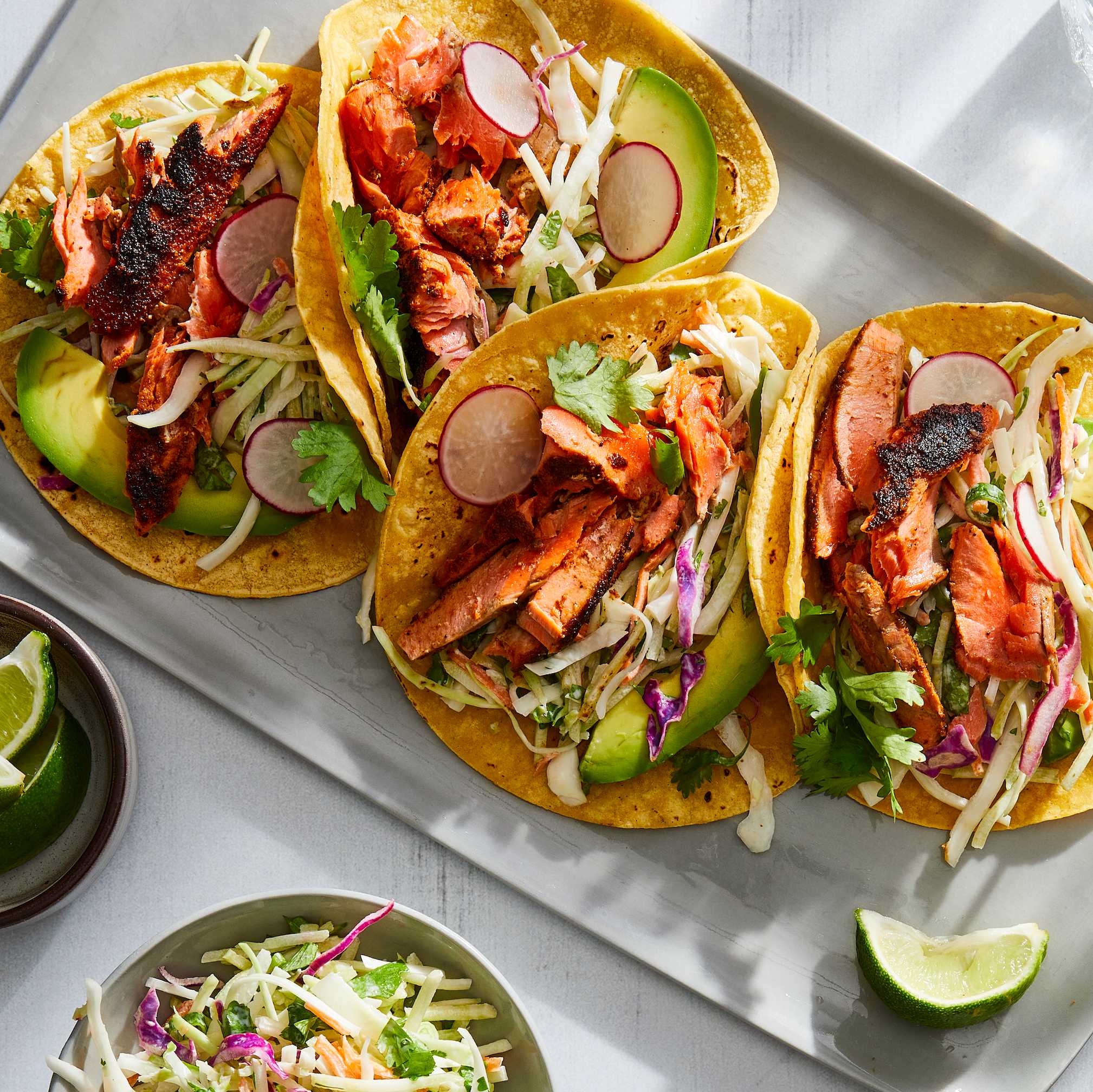 Move over white fish. We’re filling our fish tacos with spicy, full-flavored salmon. It may not be traditional, but it is yummy!