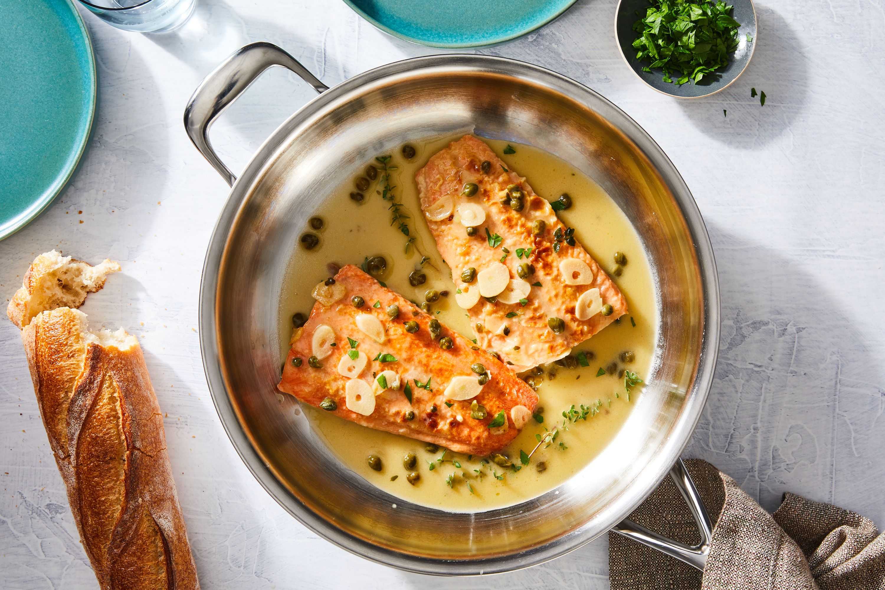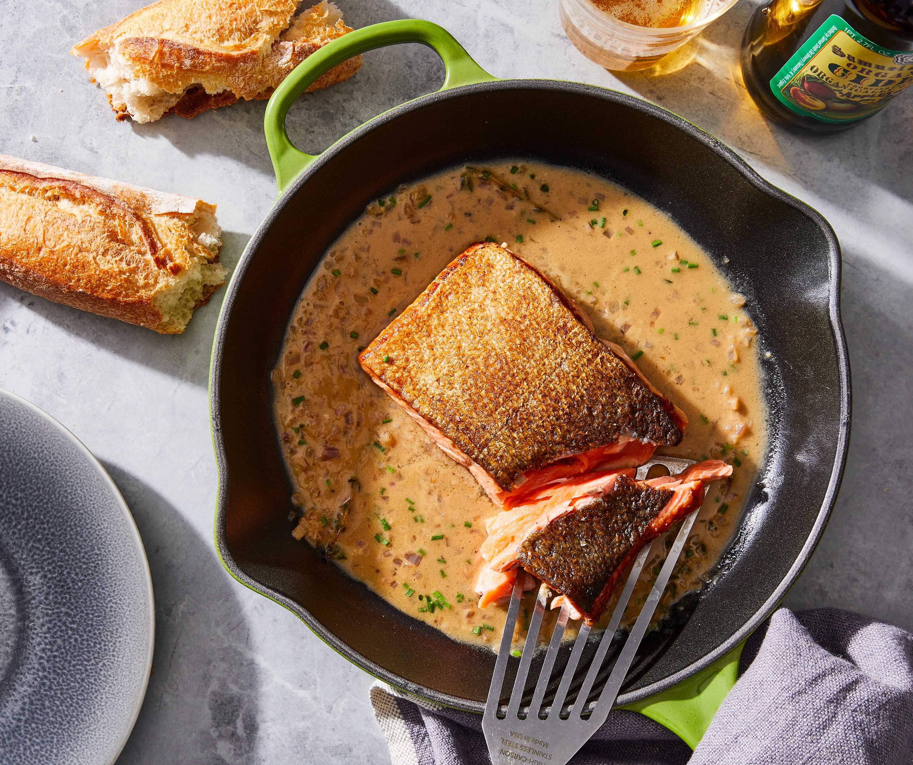The crisp, slightly bitter hard cider adds depth and fruitiness to this simple pan sauce which is a perfect balance to the rich salmon.