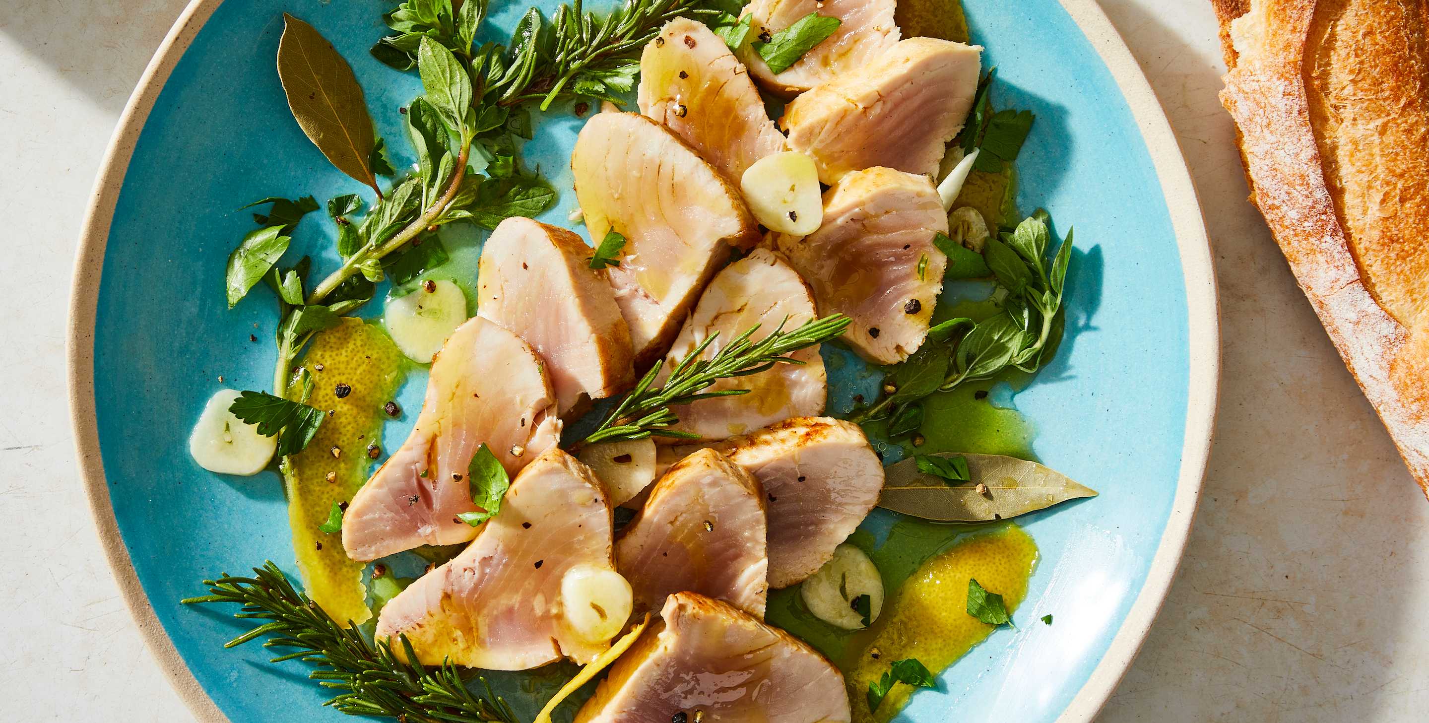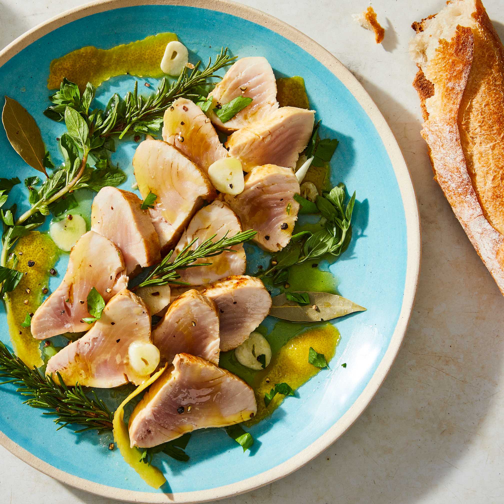 Salmoriglio, the Sicilian word for brine, is a southern Italian sauce of tart lemon juice, garlic, and fresh herbs. It makes an excellent accompaniment to rich, fresh tuna.